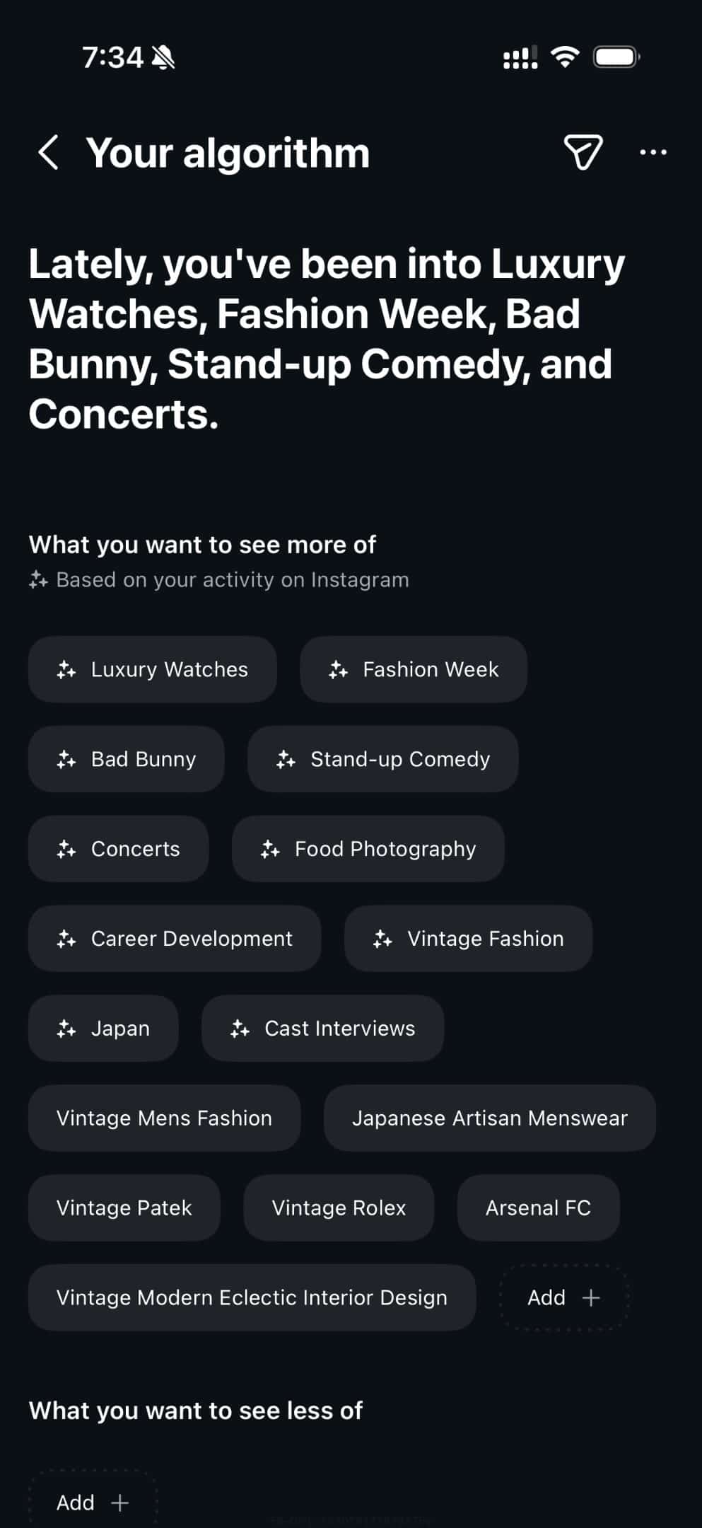 As you can see in the screenshot below, the new section lets users view and manage topics affecting their feed. At the top, it shows a summary titled “Your algorithm,” mentioning what Instagram thinks you’ve been interested in lately, such as Luxury Watches, Fashion Week, and Bad Bunny.