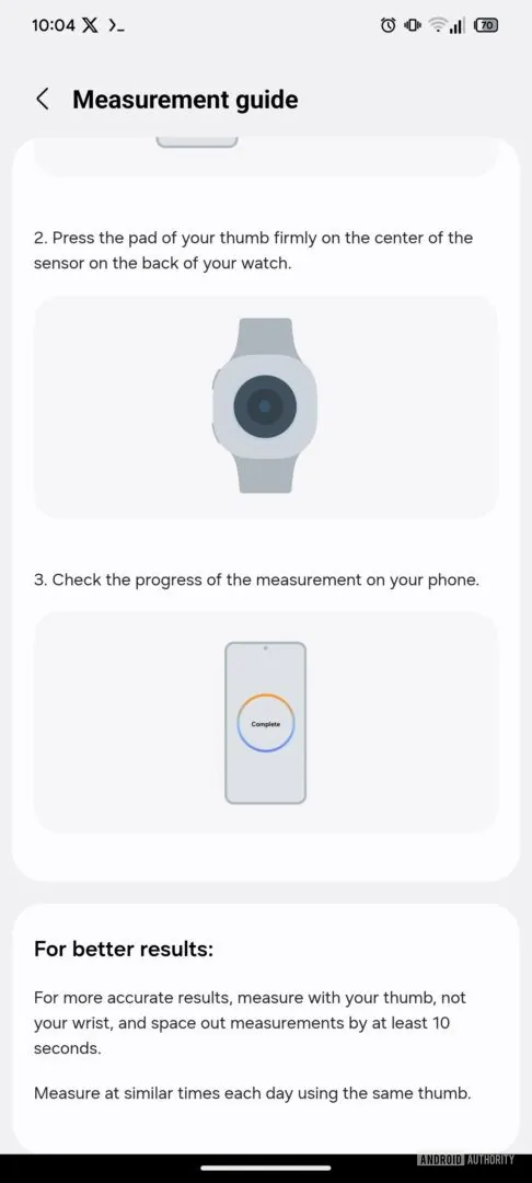 The leak Measurement guide page reveals that you need to connect your Galaxy Watch to your phone. Then, press the pad of your thumb firmly on the center of the sensor on the back of the watch. You can now check the progress of the measurement on your phone via the Samsung Health app. This means the feature won’t work while wearing the watch — you have to remove it to measure your beta carotene levels.