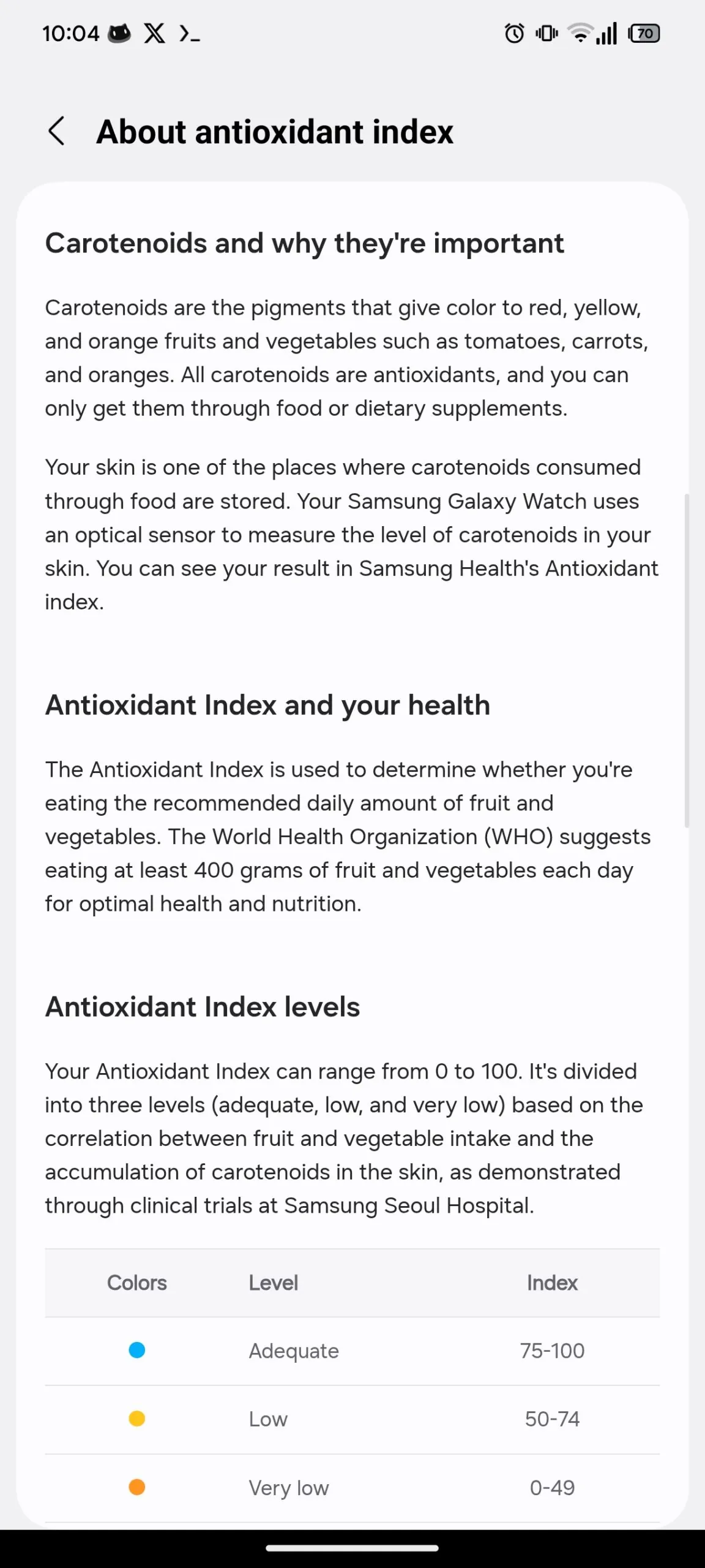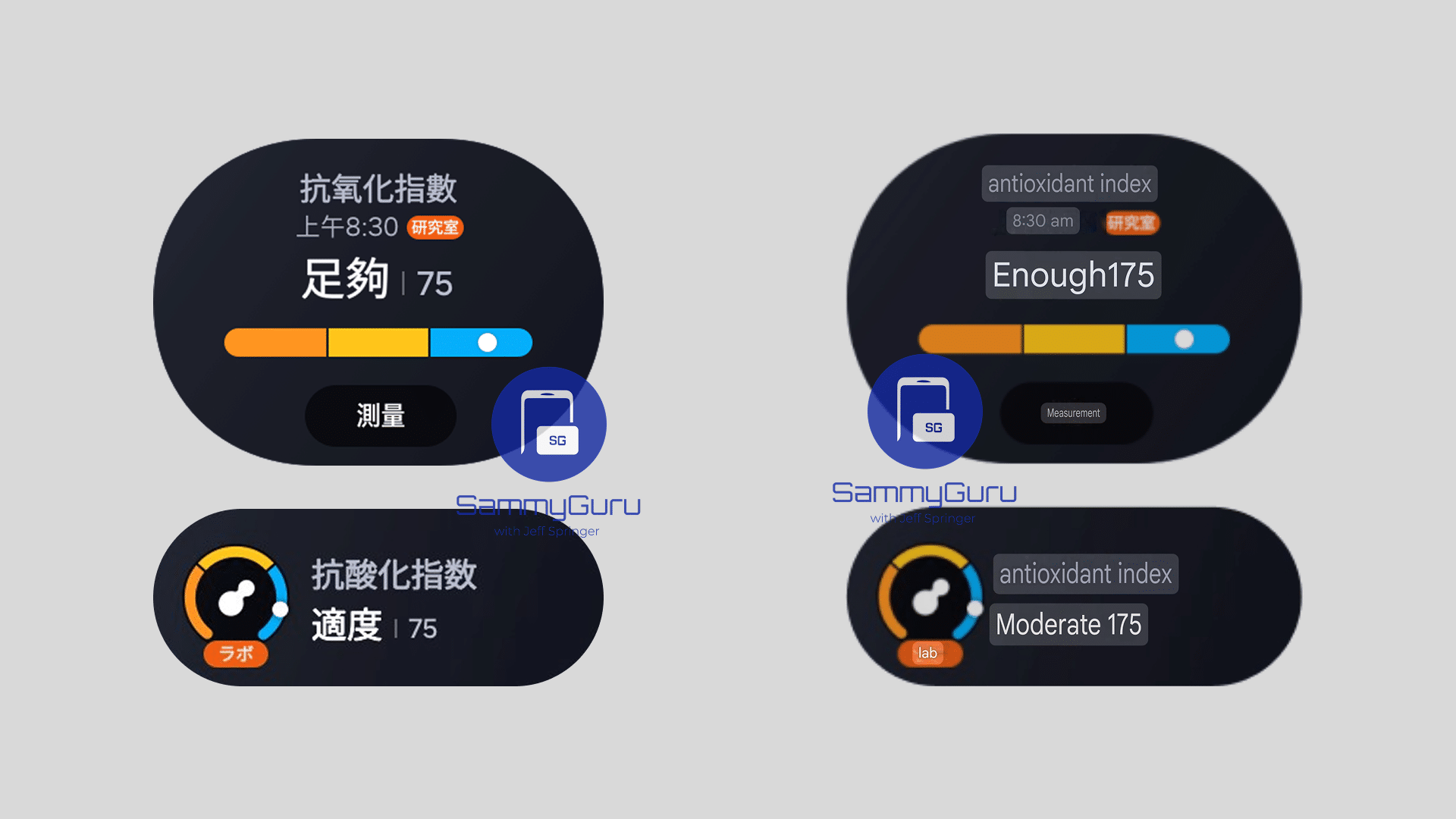Based on the correlation between fruit and vegetable intake and the accumulation of carotenoids in the skin, the feature will measure your level in three categories: adequate, low, and very low. Previously, we exclusively revealed how your Antioxidant Index level will look in both full and half tile sizes on your Galaxy Watch screen.