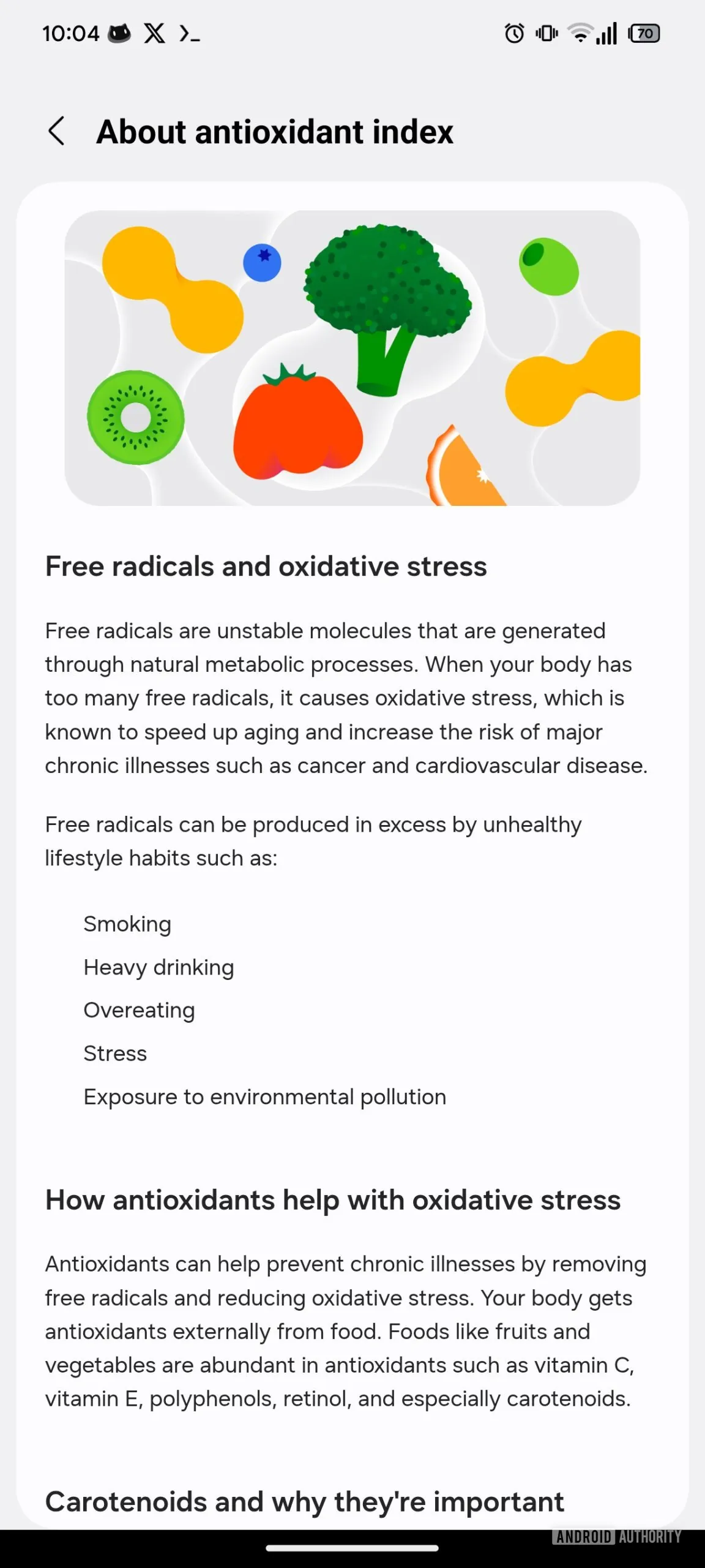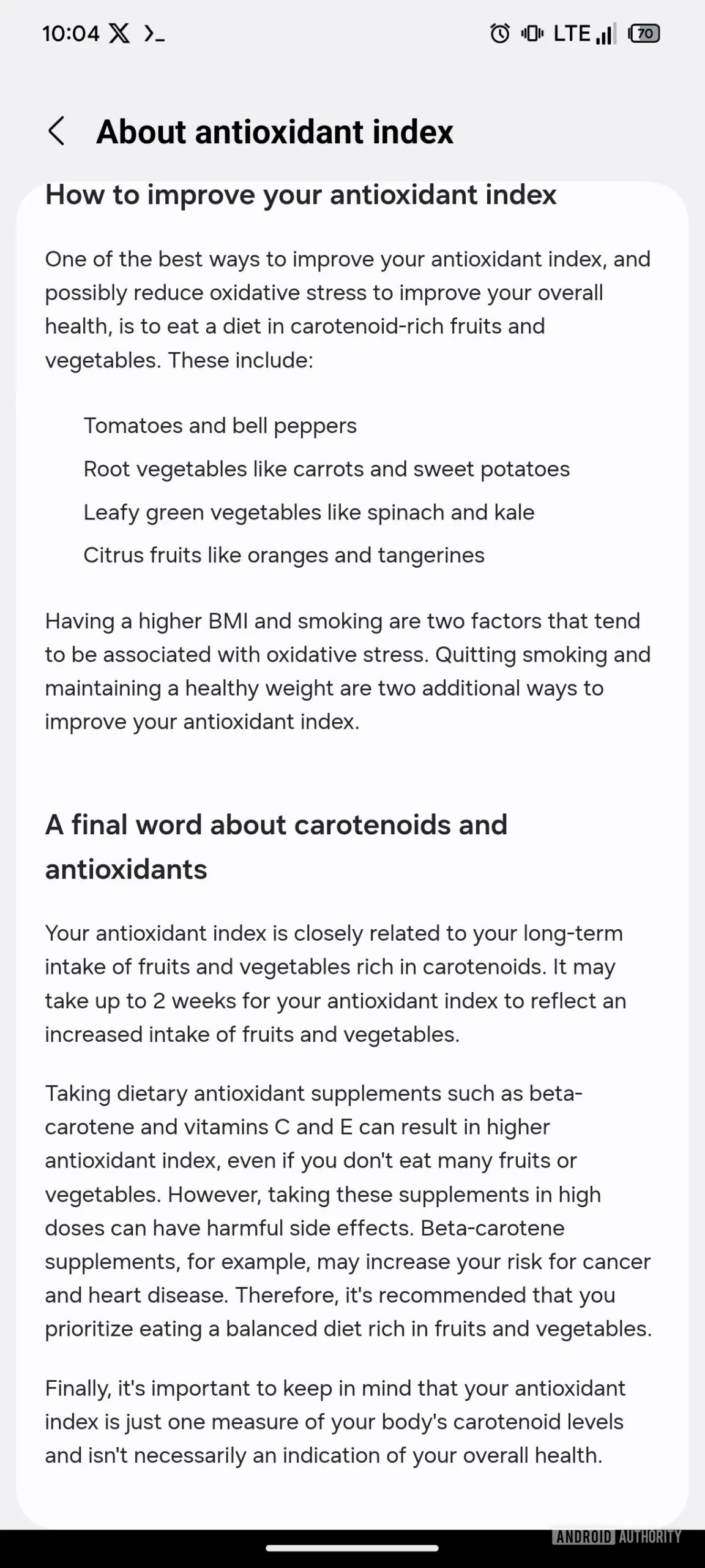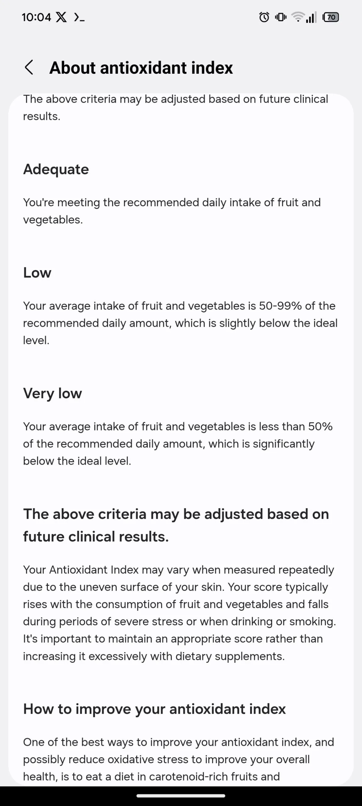 Meanwhile, the About Antioxidant Index page reveals plenty of information, including how it can help users, its importance, different index levels, and more. Antioxidants can help prevent chronic illnesses by removing free radicals and reducing oxidative stress. The health feature will help you understand whether you are eating the recommended daily amount of fruit and vegetables.