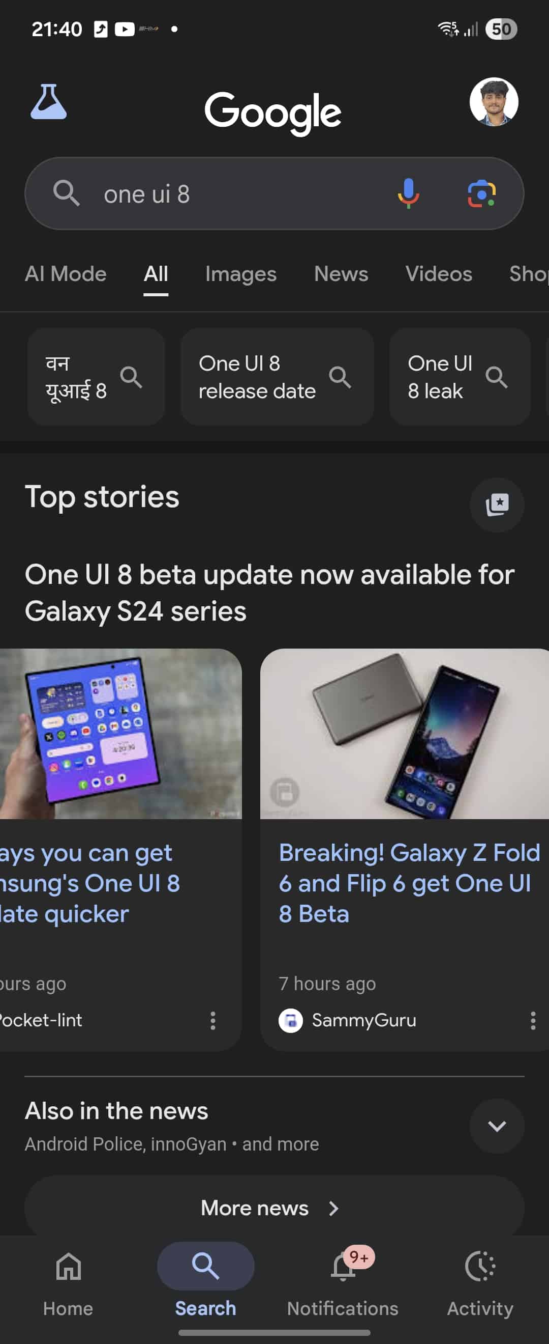 - Search for a current topic, like One UI 8, until you see “Top stories.”