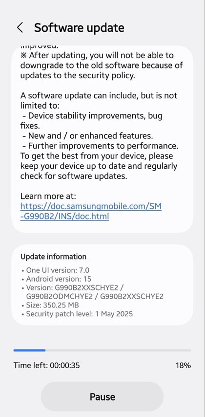 As of this writing, the May 2025 update is available for the Snapdragon variants of the Galaxy S21 FE. Samsung is currently rolling out the new SMR in India with firmware version G990B2XXSCHYE2. The OTA (over the air) firmware package weighs approximately 350MB and doesn’t bring anything more than this month’s security fixes.