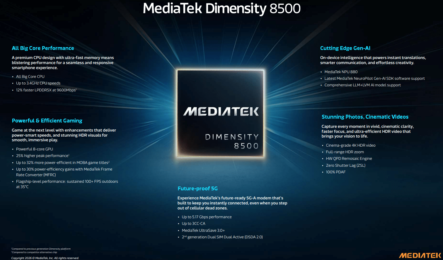 In addition, the Dimensity 8500 supports ray tracing for mainstream mobile games, allowing users to enjoy more realistic image quality. Thanks to MediaTek’s 8th-generation NPU, the chip supports global mainstream large language models (LLMs/MLLMs) and image generation models. It also features an AI ultra-clear telephoto algorithm to improve long-range photos. Likewise, the Dimensity AI semantic engine intelligently optimizes image frames.