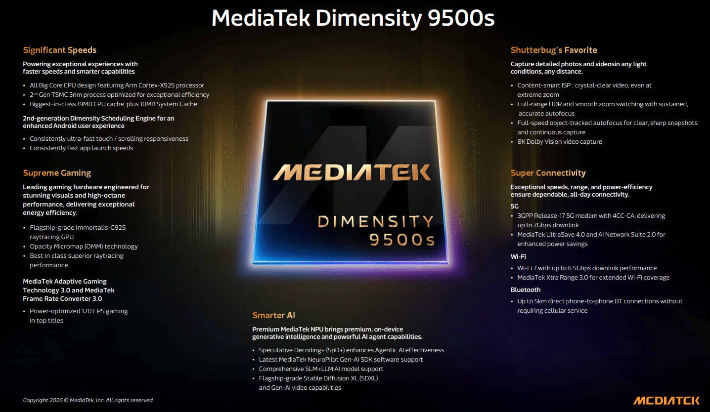 Thanks to the flagship NPU, the Dimensity 9500s are optimized for tasks such as AI photo editing, generative reasoning, and content summarization. Moreover, the chips’ MediaTek Imagiq image processor supports 8K Dolby Vision HDR video recording and 30fps real-time motion tracking.