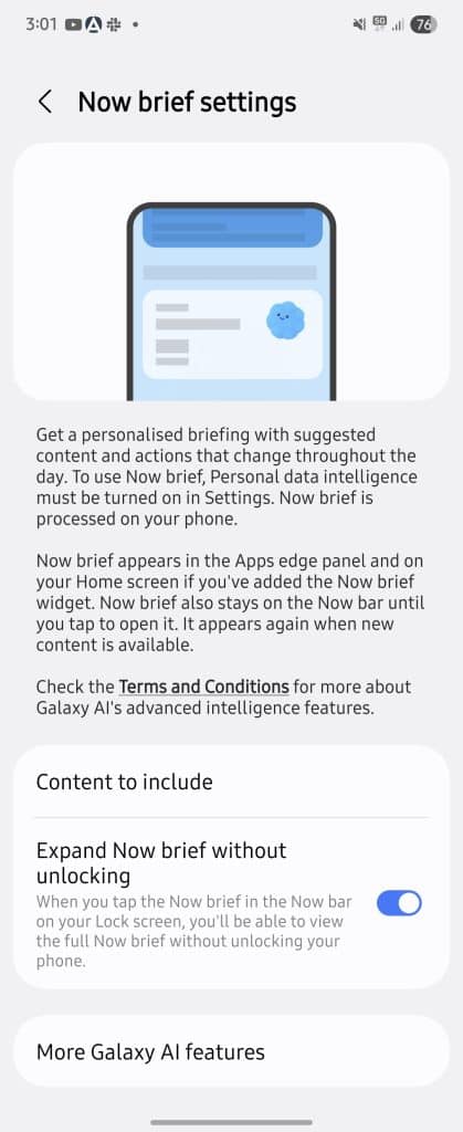 For anyone who hasn’t used it much, Now Brief functions like a compact end-of-day digest. It pulls together your reminders, schedules, updates and activity summaries into a single screen. With the latest update to Samsung’s Personal Data Intelligence app, a new option called “Nano Banana image creation” appears inside the Now Brief settings.