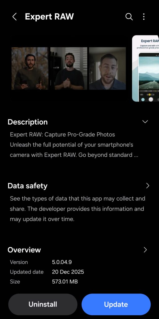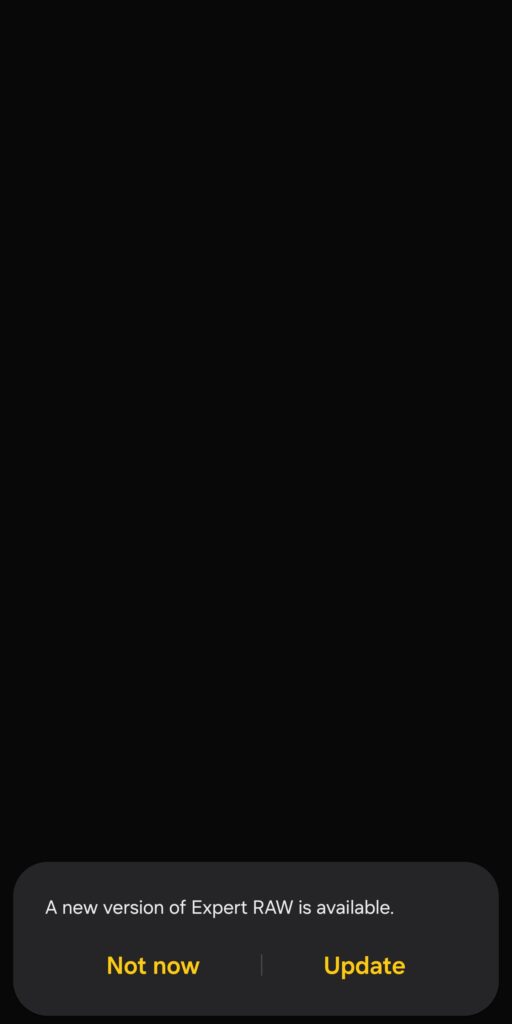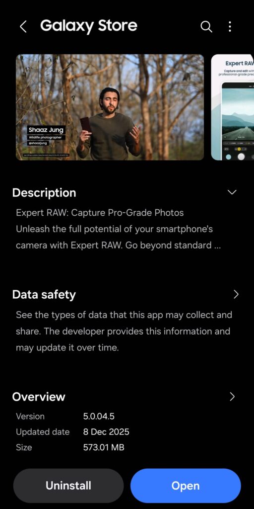 However, for Galaxy S25 users participating in One UI 8.5 Beta, the app is currently broken. The app no longer works on the second beta build, and this isn’t an isolated glitch. We tested multiple Galaxy S25 units running the latest beta, and the issue occurs across all of them. When launched, Expert RAW prompts users to update the app via the Galaxy Store, but no update is actually available, leaving the app unable to open.