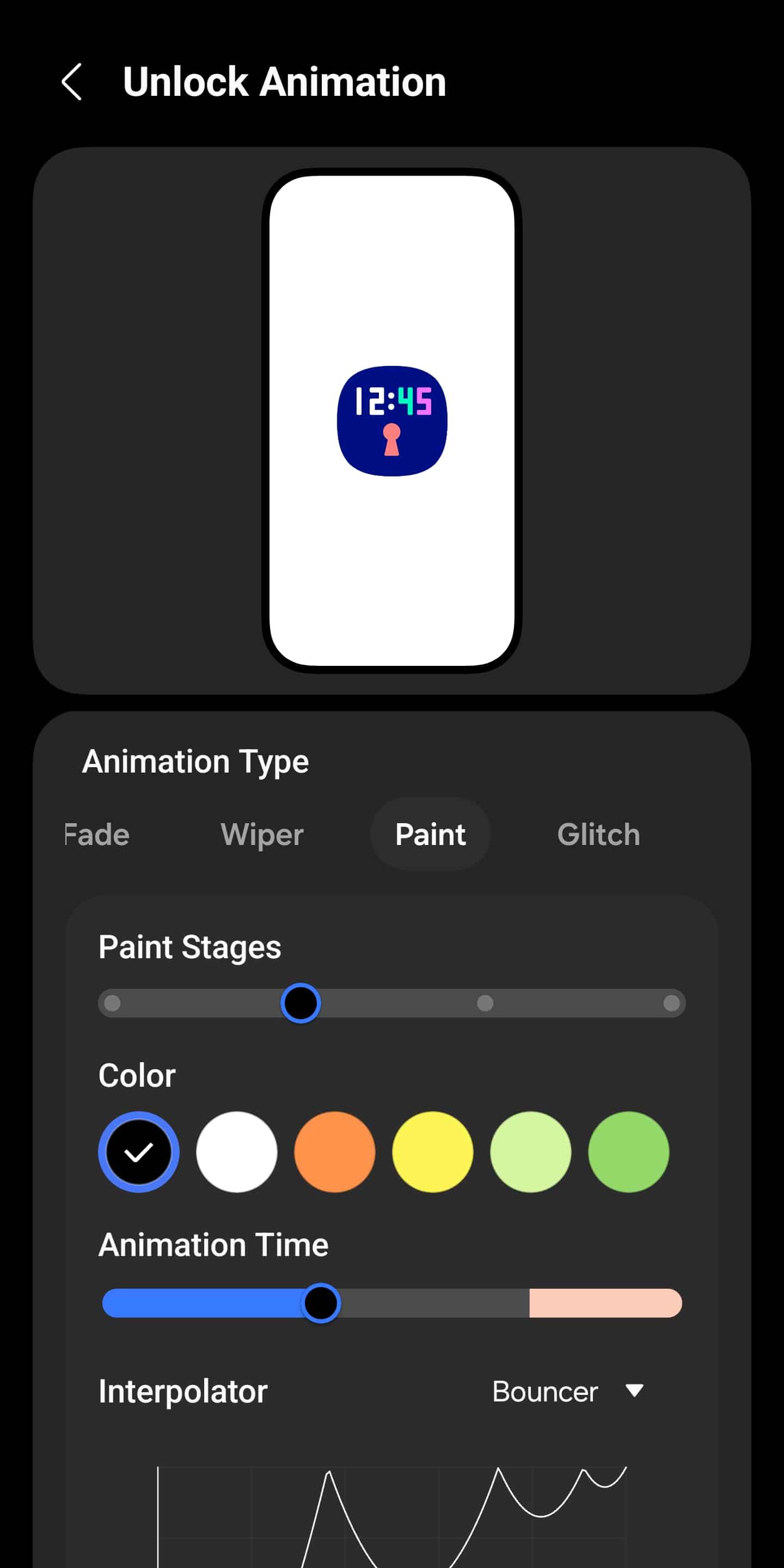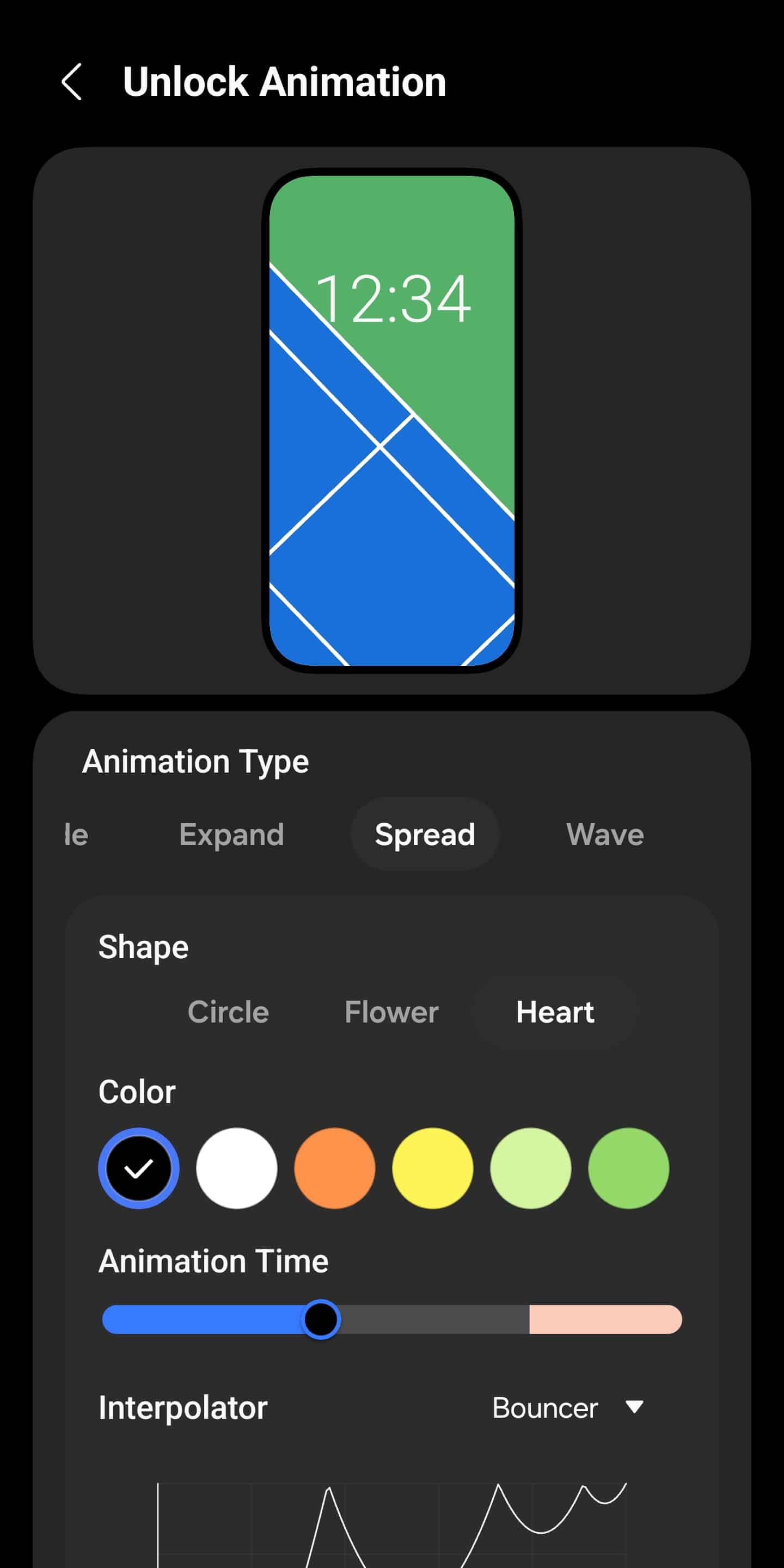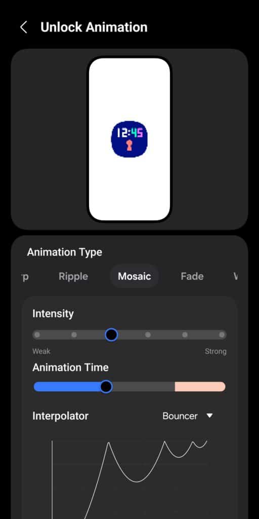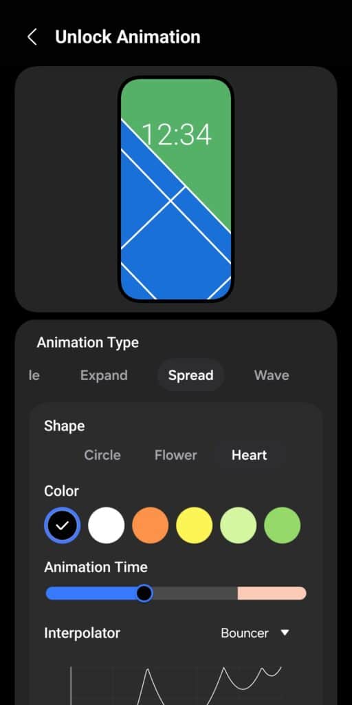 Once you choose an animation style, LockStar lets you fine-tune it in detail. You can adjust the direction, shape, color, intensity, size, and more. Samsung also allows you to set the animation duration — keeping it shorter can make unlocking feel noticeably snappier. To finish things off, you can customize the interpolator to precisely control how the animation behaves.