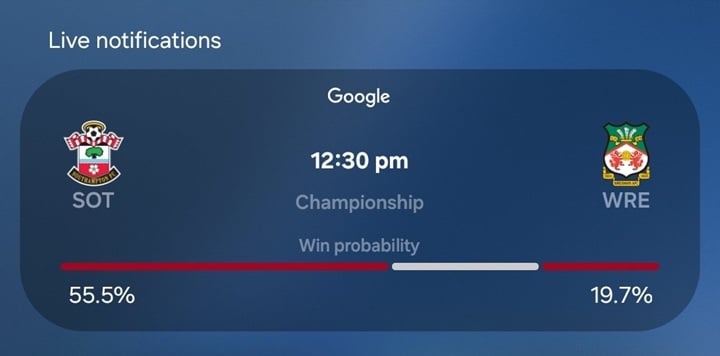 Google’s Sports on Now Bar lets fans stay connected to their favorite team’s matches, even when they can’t watch live. It delivers real-time scores right to the lock screen, with extra details available in the notification panel. Now, it’s getting even better with the addition of win probability metrics, giving you instant insight into each team’s chances of victory as the game unfolds.