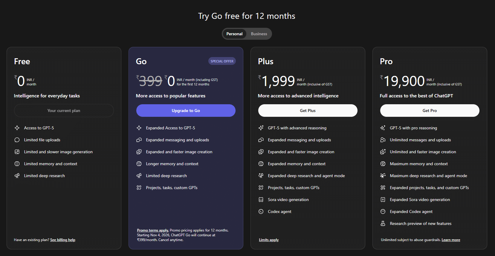 With the ChatGPT Go plan (INR 399 per month), you get access to OpenAI’s flagship model, GPT-5. The plan also lets you enjoy extended access to image generation, file uploads, and advanced data analysis tools. Now, if you live in India (whether you are a new or an existing free user), you can redeem the plan for free. Even existing ChatGPT Go subscribers can take advantage of it.