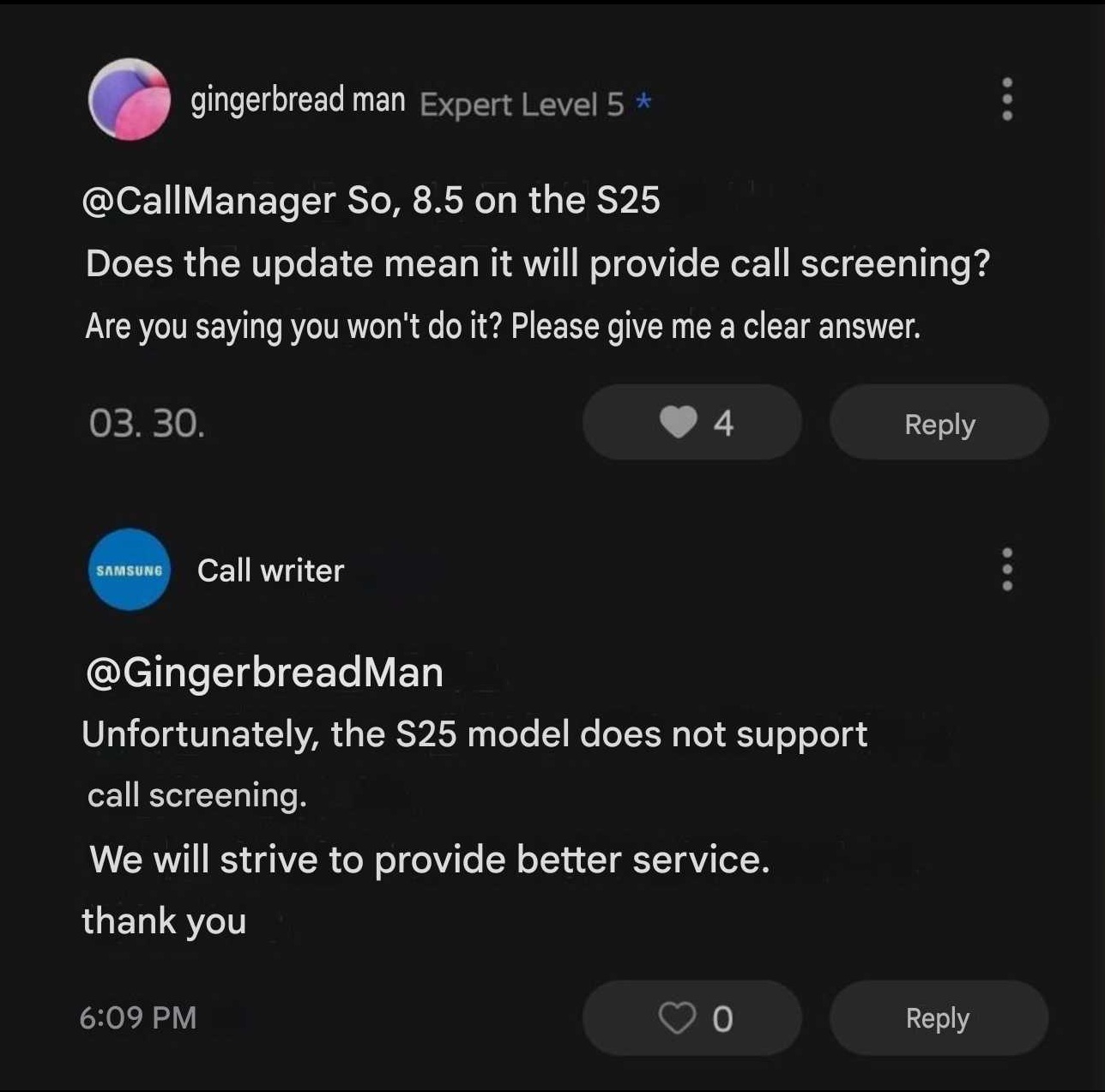 UPDATE (April 1, 2026): In a separate conversation, another customer support representative stated that the Galaxy S25 series “does not support call screening.” However, it’s unclear whether this means the feature will never arrive or if it’s being held for the stable One UI 8.5 update. Hopefully, it’s the latter, as there’s no hardware limitation preventing call screening from working on the Galaxy S25 or even select older phones.