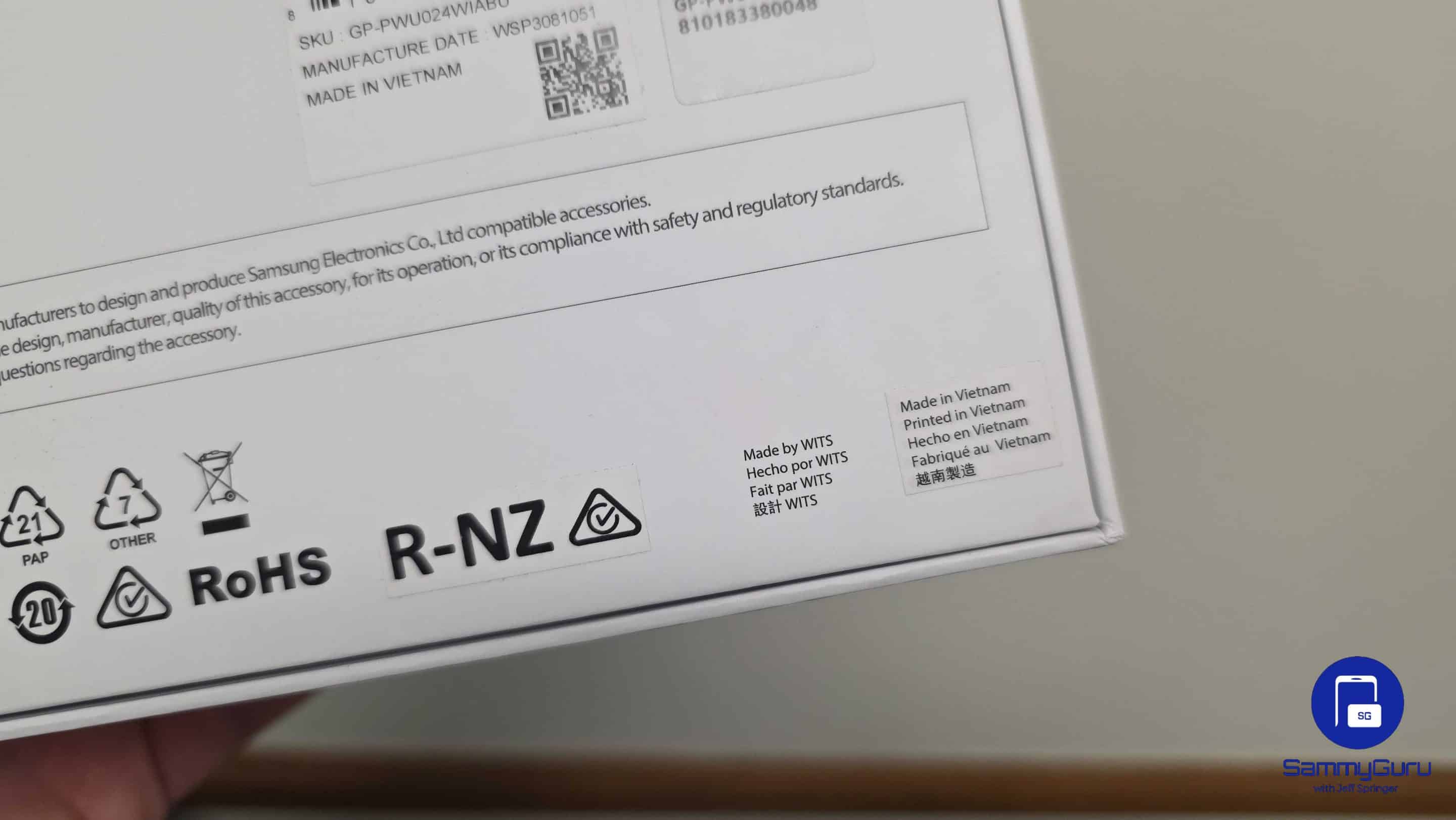 It comes in white packaging with the “Designed for Samsung” branding on top. Inside, you’ll find the 3-in-1 wireless charger, a 45W charging adapter, a 1m USB-C-to-C cable, and some paperwork. The charger supports a max of 15W wireless charging, and if you flip it over, you’ll spot the tiny print revealing it’s made by WITS. This company acquired Samsung Electro-Mechanics’ wireless charging business back in 2019.