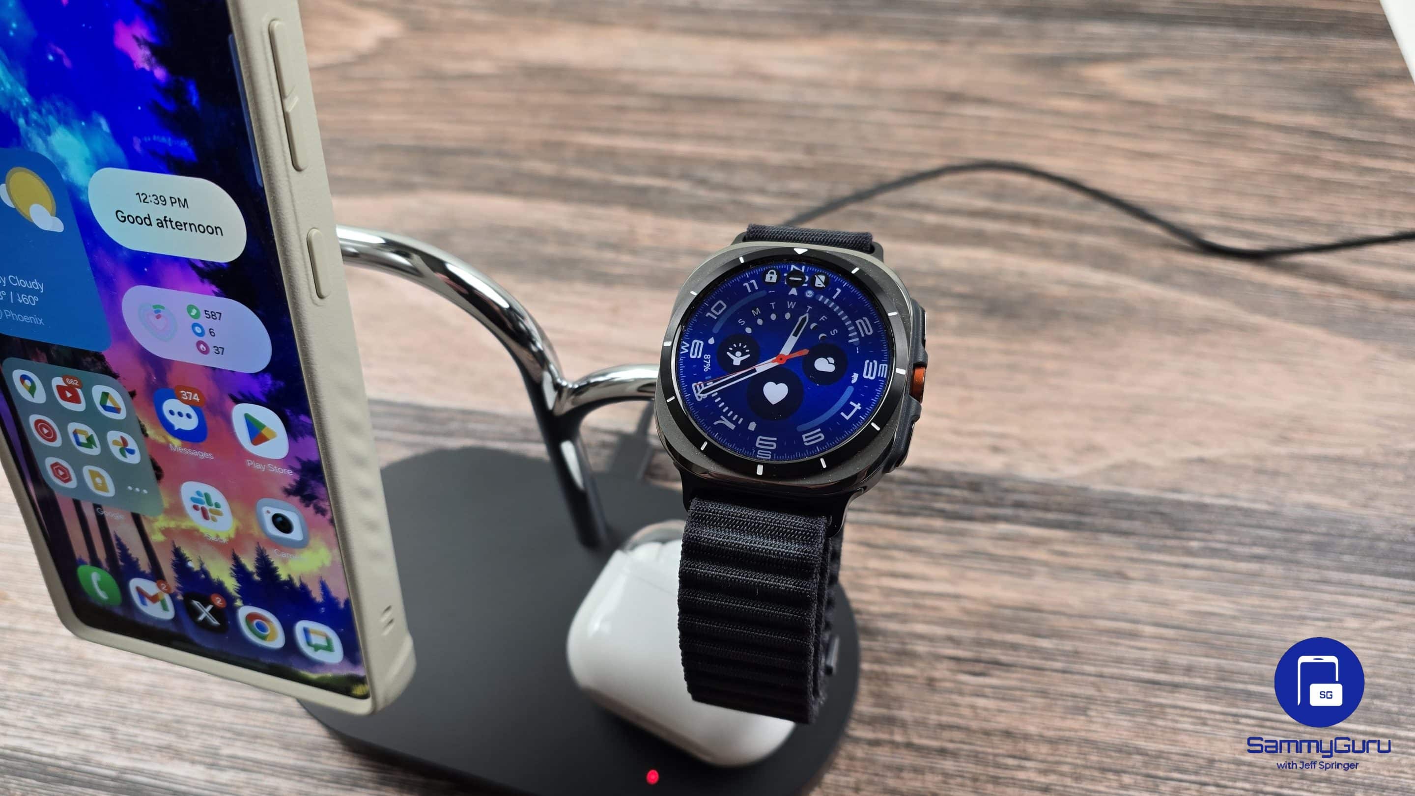 You can charge your Galaxy phone, your Galaxy Watch, and Galaxy Buds simultaneously. You can see us charging the Galaxy S25 Ultra, Galaxy Watch Ultra, and Galaxy Buds 3 Pro simultaenously. It does look neat, overall, which is honestly we were also expecting.