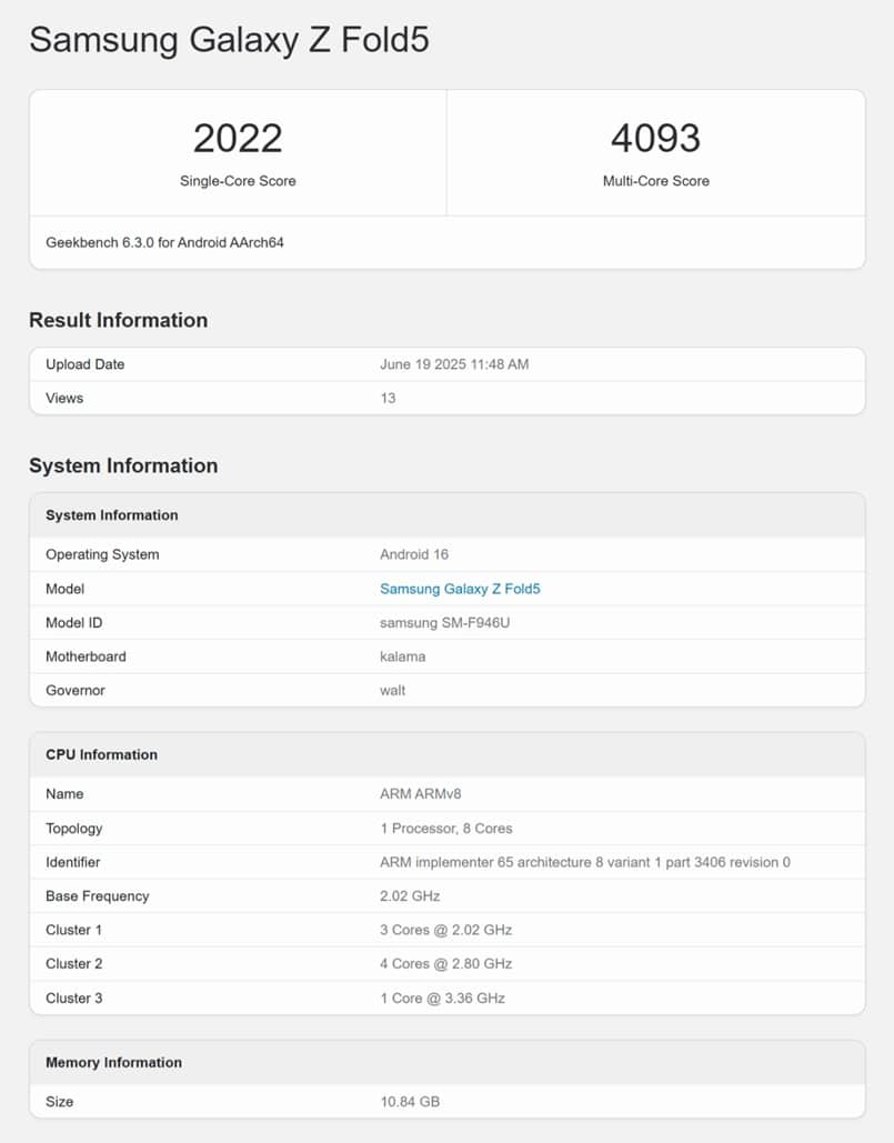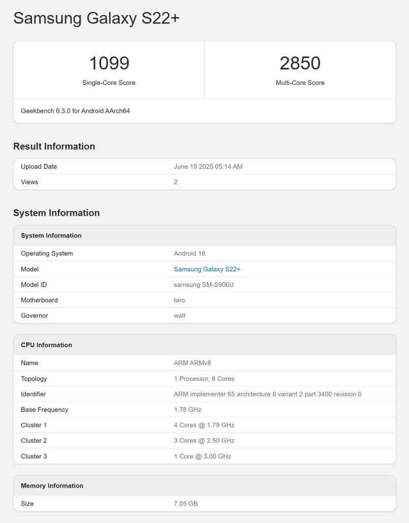 The Galaxy Z Fold 5 and the Galaxy S22+ were benchmarked multiple times on Geekbench v6.3 with Android 16 onboard. These appearances suggest internal testing of One UI 8 is underway for both models. As you can see in the screenshots below, the Geekbench scores are pretty underwhelming, signaling ongoing development and optimization of the new software (thanks, @Alfaturk16!).