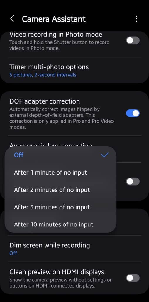 Camera Assistant also lets you customize the camera timeout, customize the timer for multi-photo options, dim the screen when recording long videos, clear the preview on HDMI-connected displays, adjust high-resolution settings, manage audio monitoring, correct images flipped by external depth-of-field, correct distortion from external anamorphic lenses, and more. Some features are only available on flagship models.