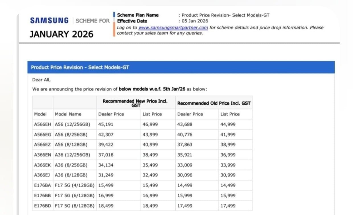 Samsung may increase the prices of some of its popular Galaxy smartphones in India starting today (January 5). The price revision will impact several Galaxy models, including the Galaxy A56, Galaxy A36, and Galaxy F17 5G. The changes could apply to all memory configurations of these phones.