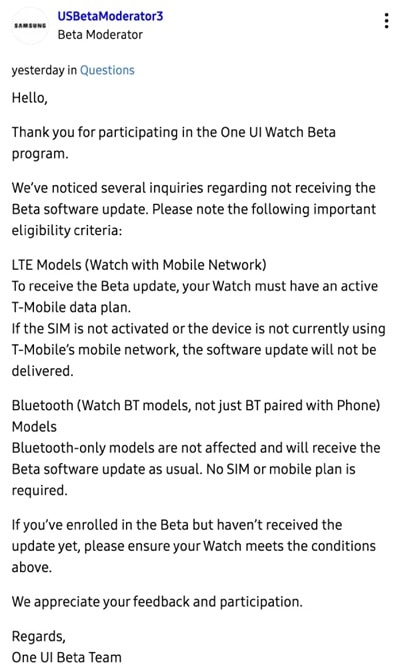 Samsung has now confirmed that for LTE models, an active T-Mobile plan is required on your connected smartphone to actually receive the beta OTA. That means if your watch isn’t using T-Mobile’s network (or doesn’t have a data plan activated), the beta won’t show up — even if you were able to join the program in the app. Unsurprisingly, users aren’t happy about it.