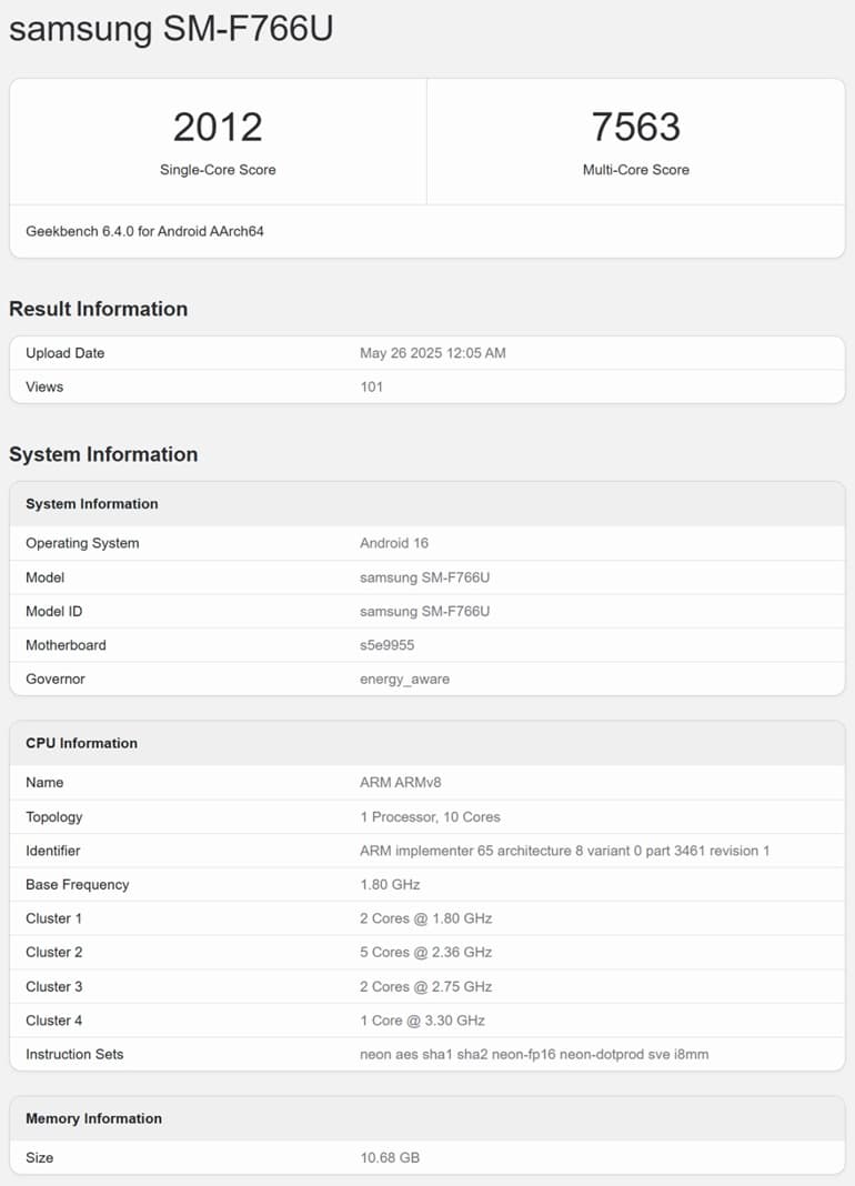 As mentioned above, the Galaxy Z Flip 7 will be the first Samsung foldable to feature an Exynos chip. And it appears the company will ship the device with its in-house processor globally. This Geekbench listing shows the US model (SM-F766U) with the Exynos 2500. Previously, flagship Galaxy phones with Exynos chips were reserved for select markets like Europe, India, and South Korea, with the US and some other regions getting a competing Snapdragon processor.