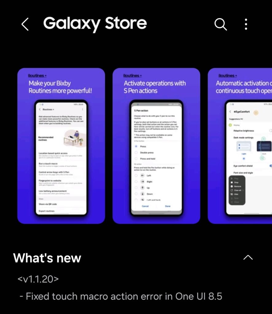 Samsung has released a new update for its Routines+ module with version 1.1.20. The update fixes a touch macro action error in One UI 8.5, improving the reliability of automation features for beta testers. Display Assistant also received official One UI 8.5 support with a recent update. These updates should reach all eligible devices in the coming weeks.
