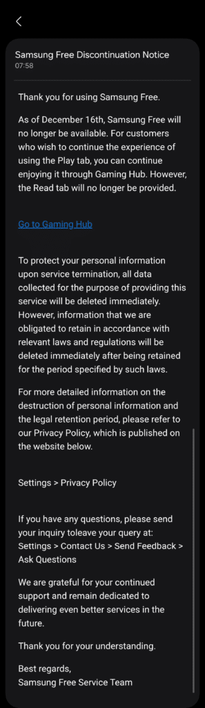 Of course, these are pretty helpful features, but most Galaxy users may not find them essential. This could be one of the reasons why Samsung has decided to discontinue Samsung Free. In its discontinuation notice, the company says that Samsung Free will no longer be available from December 16, 2025, and the system will delete all personal data collected for the service.