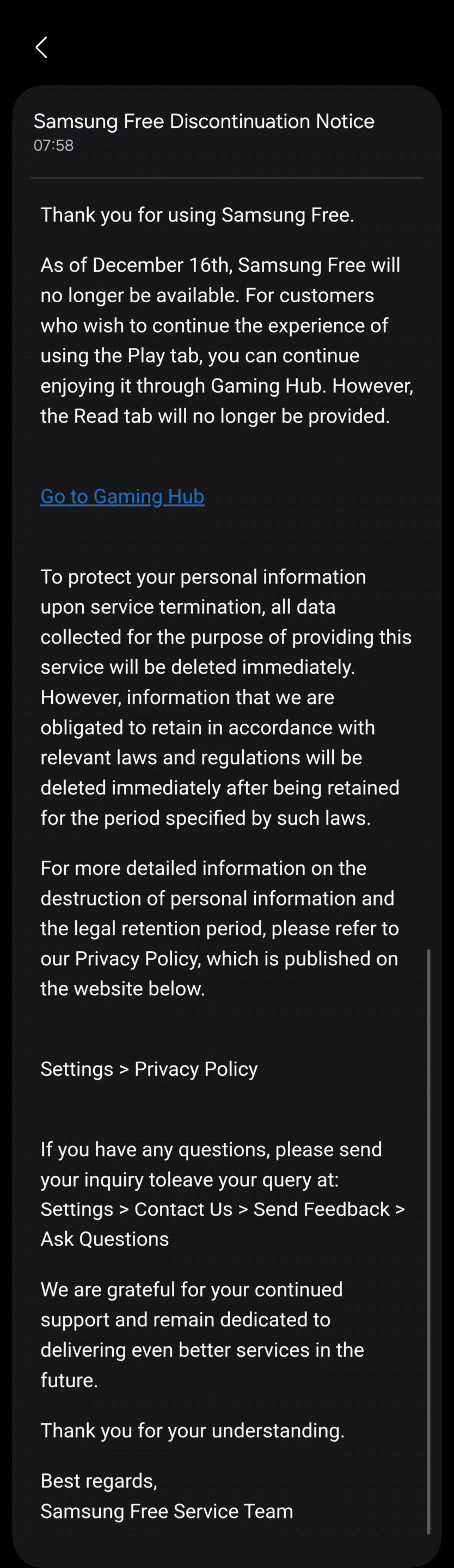 Samsung notes that only the Play tab experience will continue through the Gaming Hub, while the Read tab will be removed completely. The company also says, “We are grateful for your continued support and remain dedicated to delivering even better services in the future.” If you have any questions, you can send them to the company via Settings > Contact Us > Send Feedback > Ask Questions.
