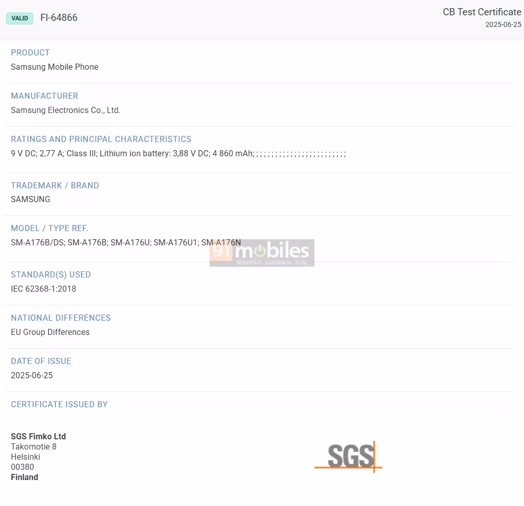 Folks over at 91Mobiles recently spotted several new Galaxy model numbers — SM-A176B/DS, SM-A176B, SM-A176U, SM-A176U1, and SM-A176N — on Finland’s SGS Fimko certification website. Based on past patterns, these model numbers in question are likely for the Galaxy A17 5G, intended for multiple markets, including the global market, the US, and South Korea.
