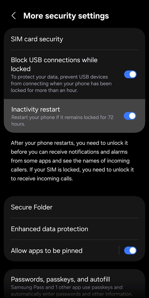 In practice, this means that anyone who finds or steals your phone won’t be able to access much information after the restart. The device requires authentication before restoring normal functionality. However, for the feature to work as intended, it’s important that your phone is locked in the first place. Otherwise, the inactivity timer won’t trigger, making the feature ineffective.