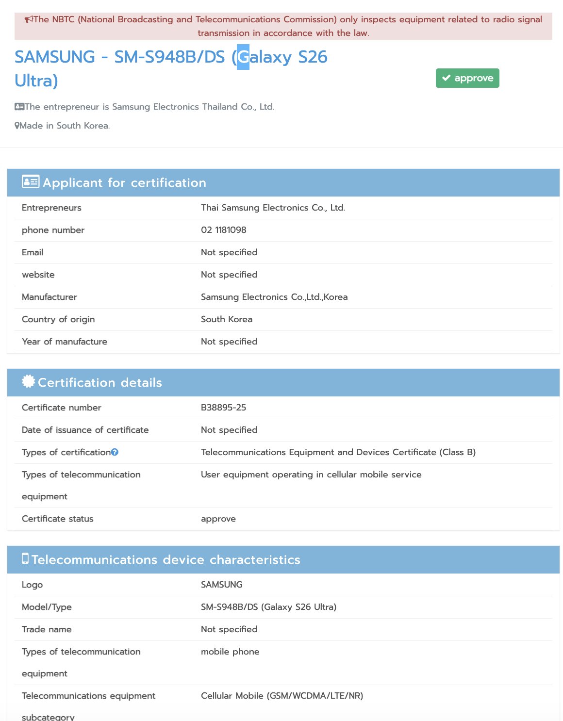 As spotted by Mukul Sharma on X, the National Broadcasting and Telecommunications Commission (NBTC) has certified the Galaxy S26 Ultra. The listing clearly mentions the marketing name “Galaxy S26 Ultra” along with the model number SM-S948B/DS. The “B” variant confirms that this is the global model, while “DS” indicates dual-SIM support.