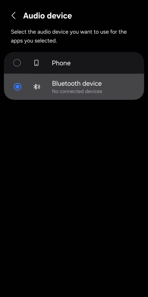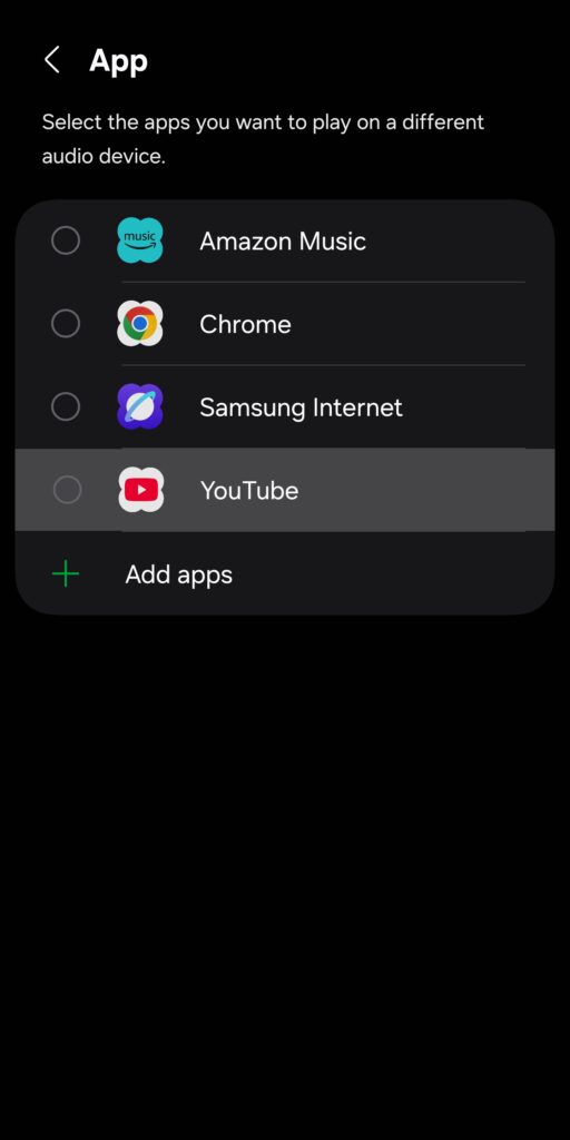 Once enabled, you can select the app you want to control. For example, if you want YouTube to play sound through your connected buds, simply select YouTube from the App list and set it to Bluetooth device.