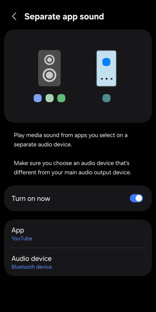 Now, whenever you watch a video on YouTube, your buds will be the default sound output device. If buds are not connected, audio will play through your phone’s speakers. However, when you connect buds, your phone’s speakers are free to play sound from another source/app. That’s not possible if Separate app sound is not configured.
