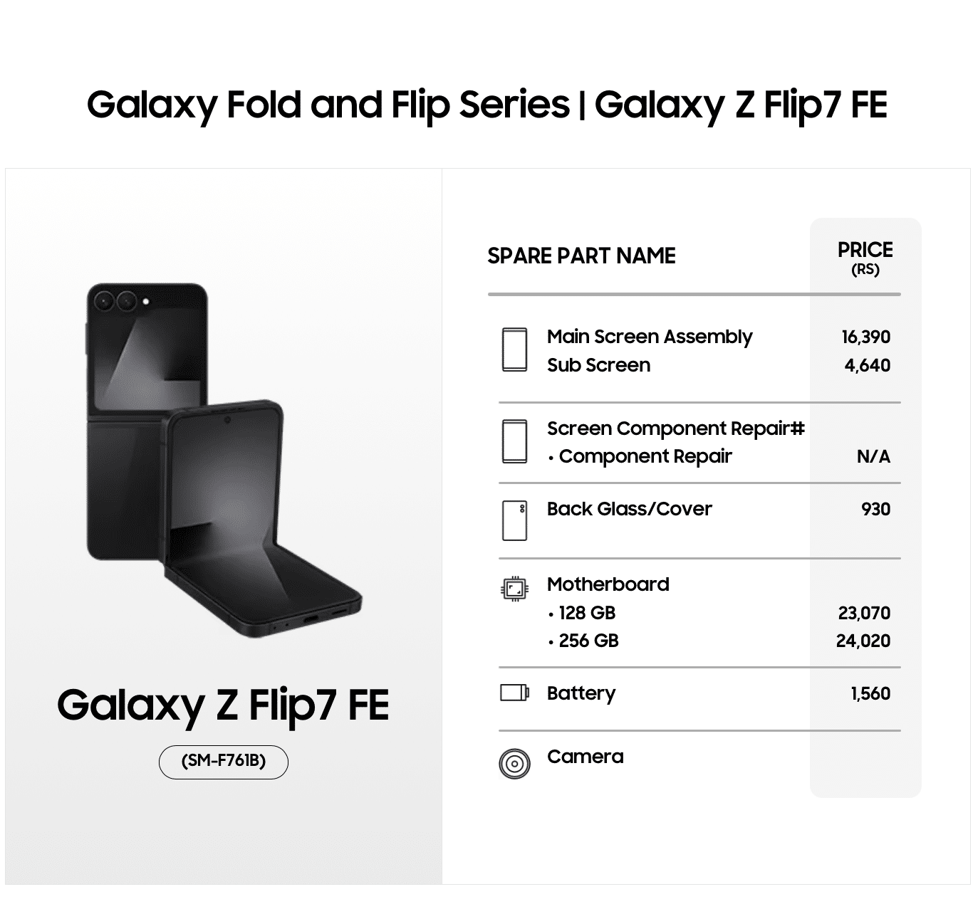 That aside, the back glass replacements for the Galaxy Z Fold 7, Flip 7, and Flip 7 FE cost INR 2,610, INR 1,230, and INR 930, respectively. This pricing is quite reasonable.