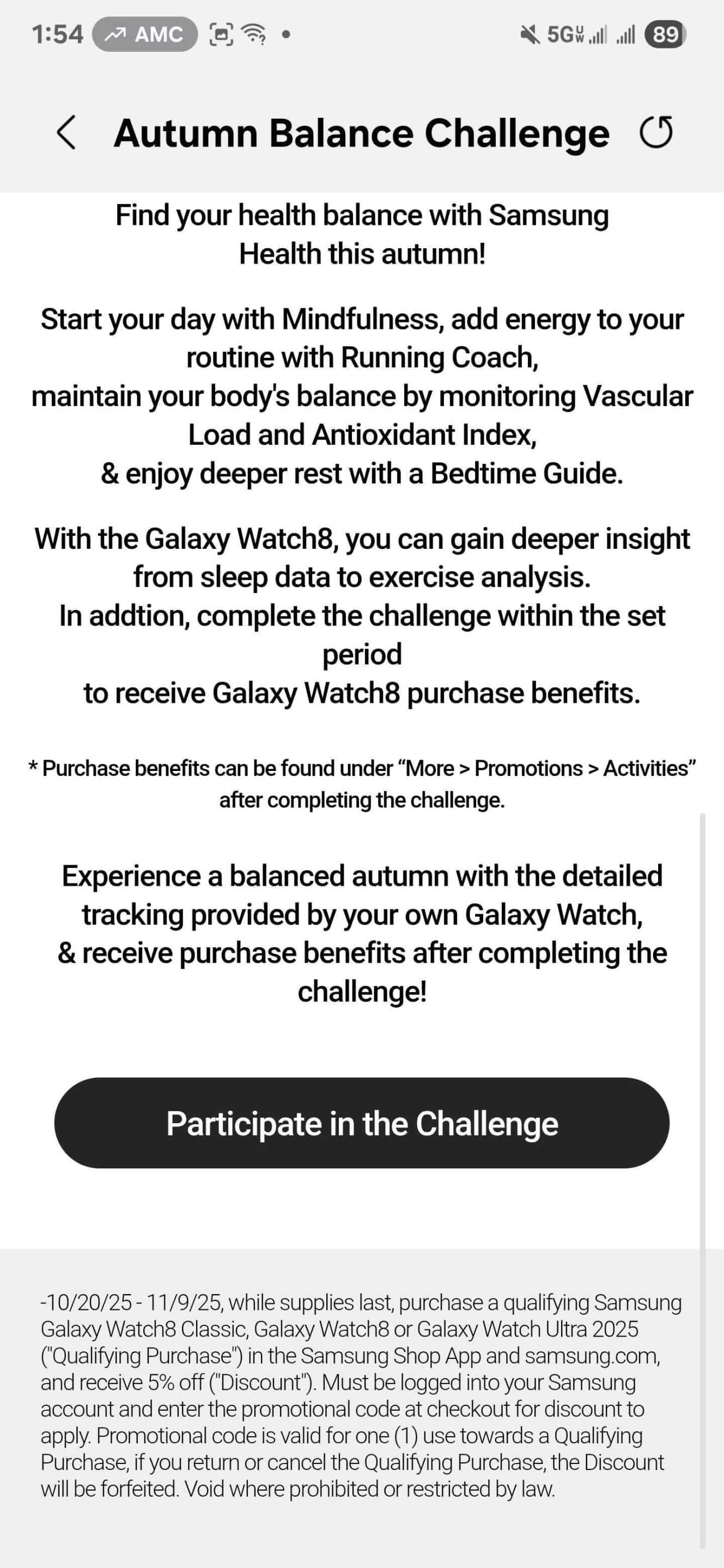 You can monitor the progress through a real-time leaderboard within the app. Once you complete the challenge, head over to More > Promotions > Activities to find your perks. You will get a 5% discount on the purchase (by applying a promotional code) of a Galaxy Watch 8 Classic, Galaxy Watch 8, or Galaxy Watch Ultra 2025. Note that you need to buy only from the Samsung Shop App or samsung.com. This is a great opportunity to upgrade your smartwatch while staying motivated to stay active.