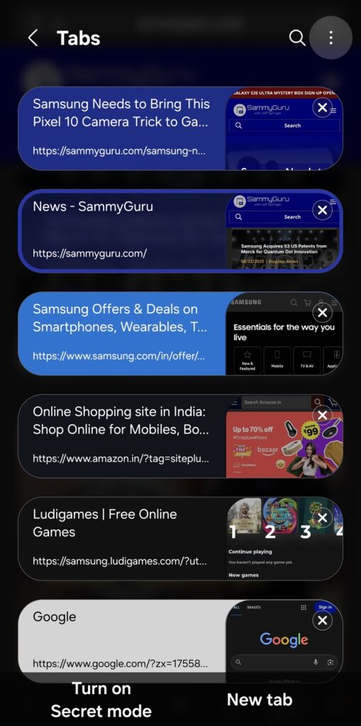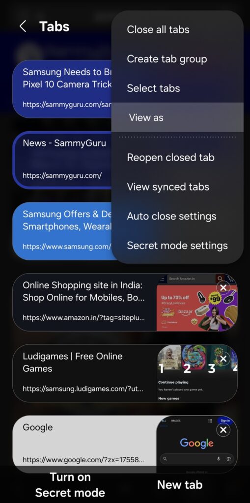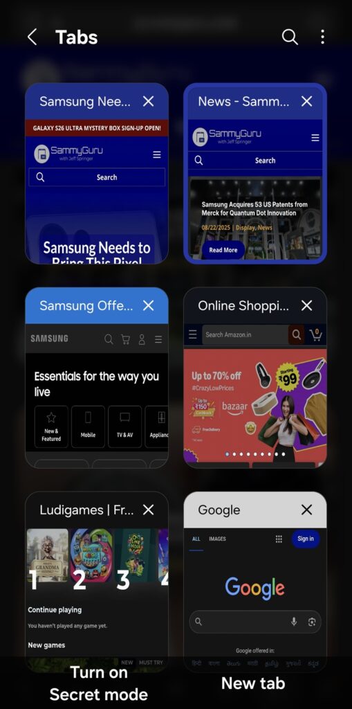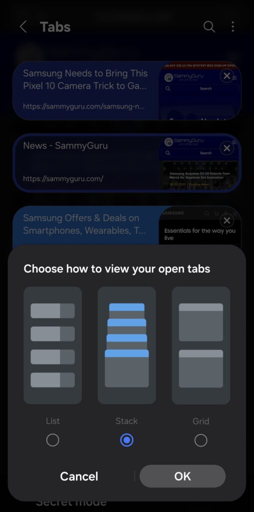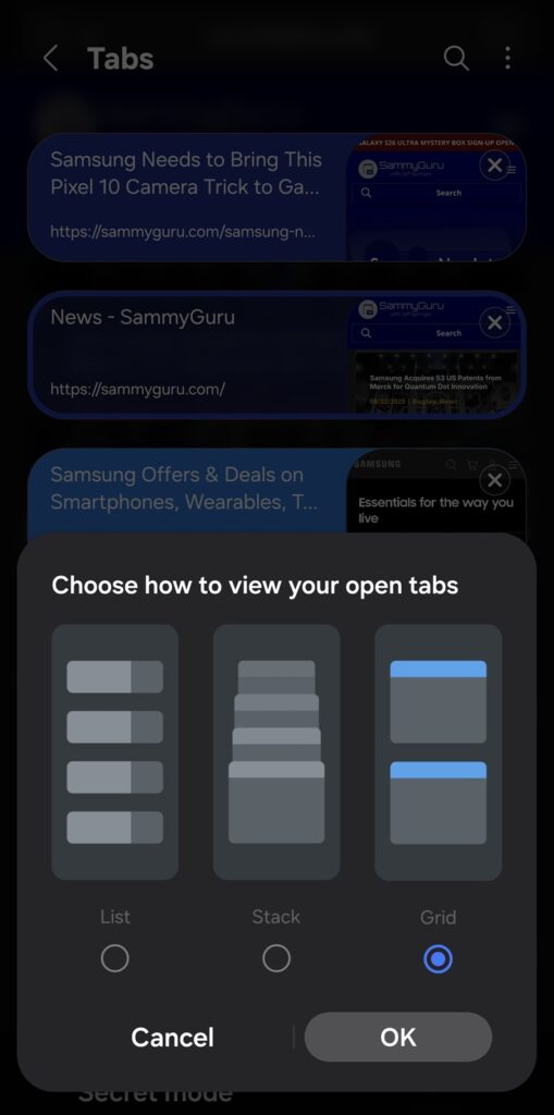 Your open tabs will immediately appear in the selected style. If you haven’t tried it yet, give the grid layout a spin — you might find it quickly becomes your preferred way to manage tabs in Samsung Internet.