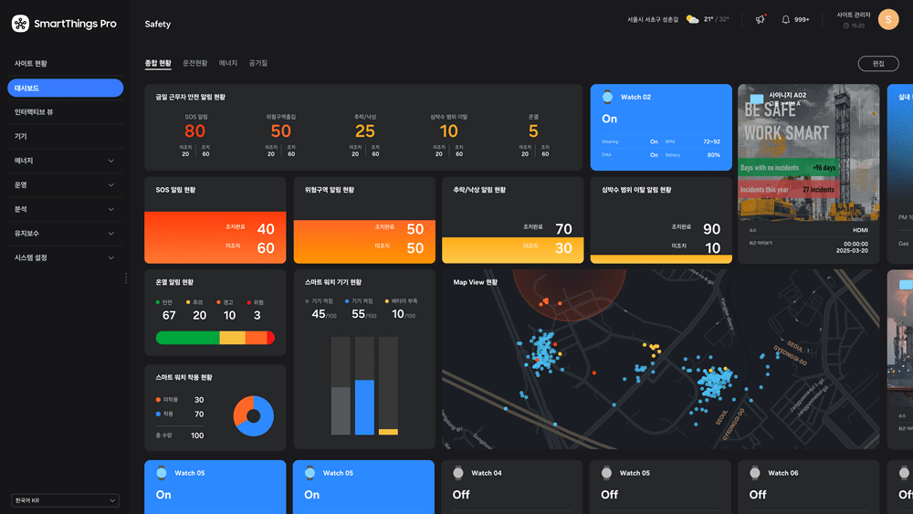 If a worker’s biometric readings show changes such as abnormal heat index or falls, the solution automatically sends notifications to nearby workers and safety managers. Moreover, workers can press the SOS button on the home screen of the Galaxy Watch in case of an emergency, such as being trapped in a confined space or detecting a fire.
