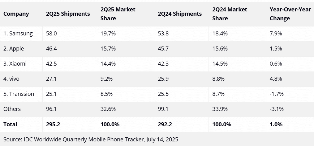 According to preliminary data from the International Data Corporation (IDC), Samsung achieved 7.9% year-over-year growth in shipments in Q2 2025, the highest among all vendors. Shipments increased from 53.8 million units in 2024 to 58 million units this year. Its global market share increased from 18.4% to 19.7% over the same period.