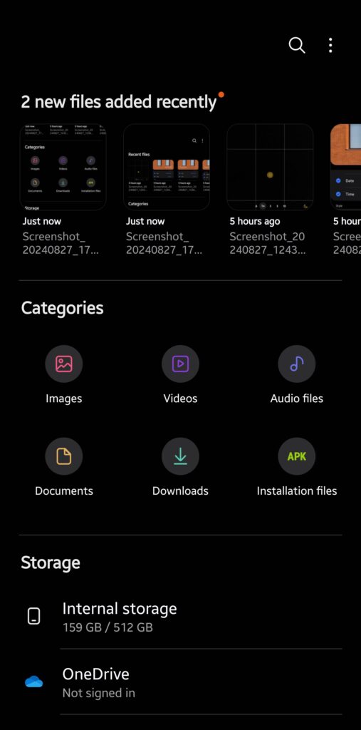 If you received a new file from a friend or downloaded from the web, you don’t need to wonder which folder it has been saved to. You will find it on the main page. Both apps offer a button to open a dedicated folder for recent files. Further down, you will find different file categories for easy navigation: Images, Videos, Audio, Documents, Downloads, and APK/Apps. Below these categories are your main storage drives and other utilities.