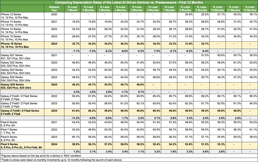 Meanwhile, the iPhone 16 has depreciated 35.4% just five months after launch, up significantly from 24.7% for the iPhone 13 — a 10.7-point increase. Apple’s resale value trend is currently moving in the opposite direction, and a flawed launch of Apple Intelligence could be one of the factors. Samsung’s Galaxy AI suite is more powerful than Apple’s AI features, and consumers know that.