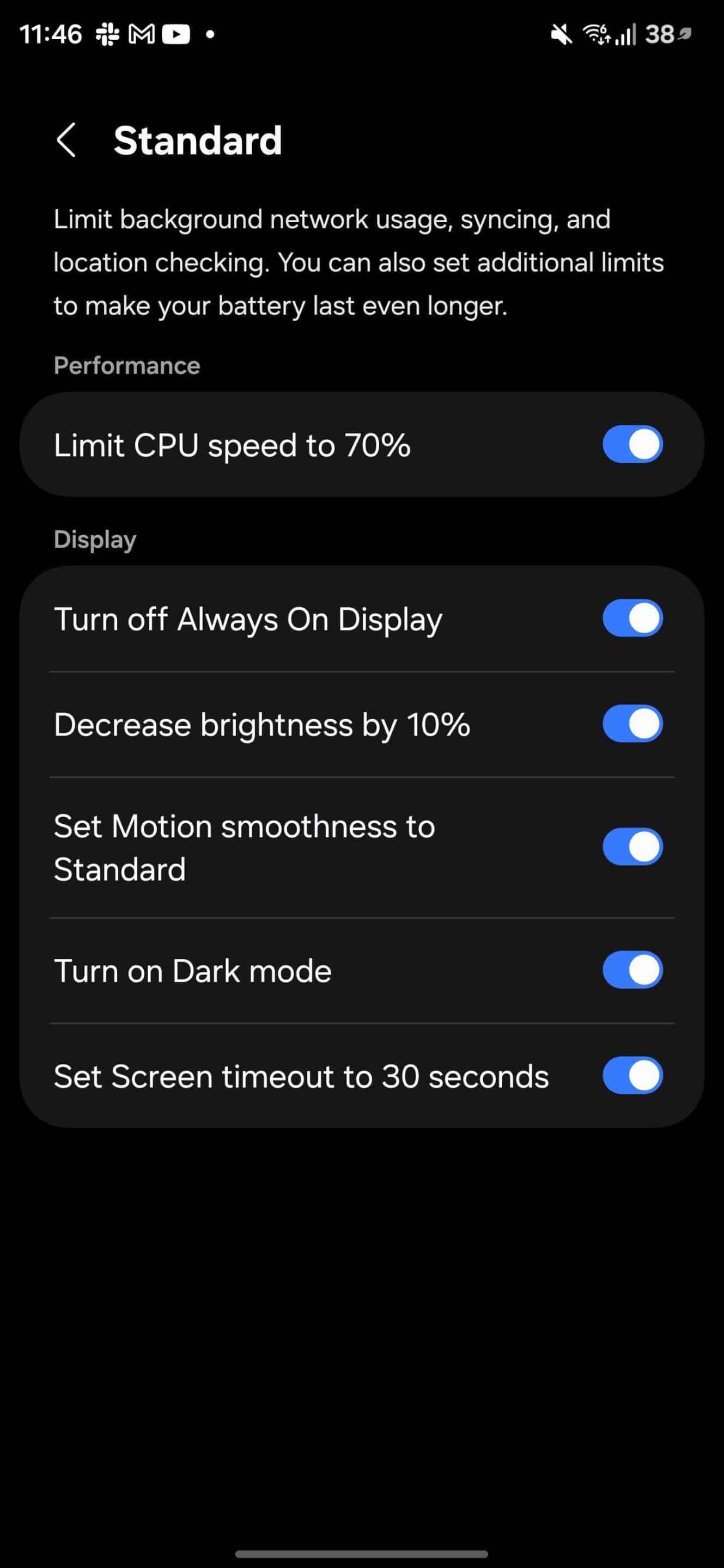Of course, Samsung retains the same core features for Power Saving as in One UI 8, but in a more organized way. For example, within Standard mode, you get the ability to limit CPU speed, decrease brightness, set motion smoothness, and more. On the other hand, the Maximum mode limits all background activity and notifications except for essential apps and apps that you choose.