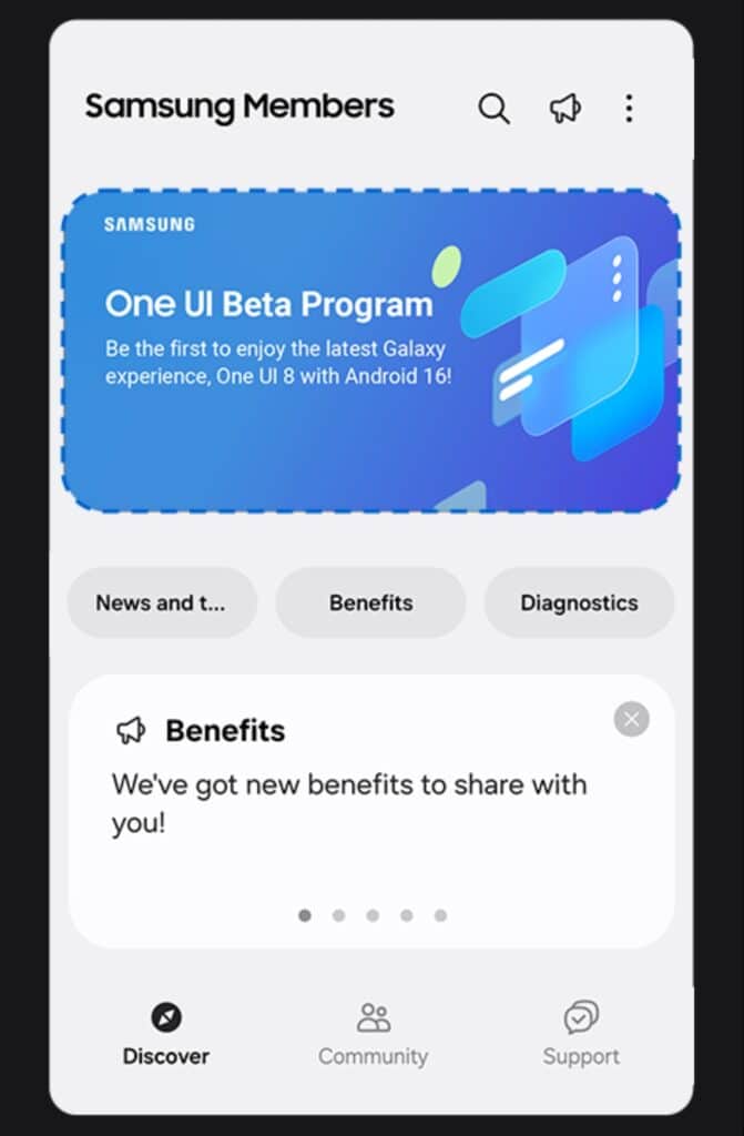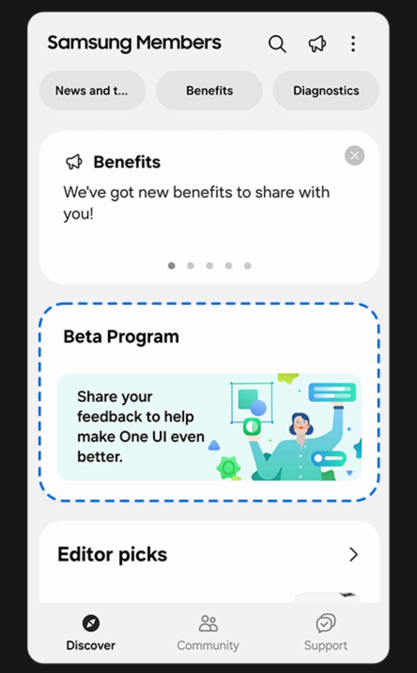 - By selecting the “Beta” section on the Samsung Members home screen (always visible, and prominently placed for active beta participants)