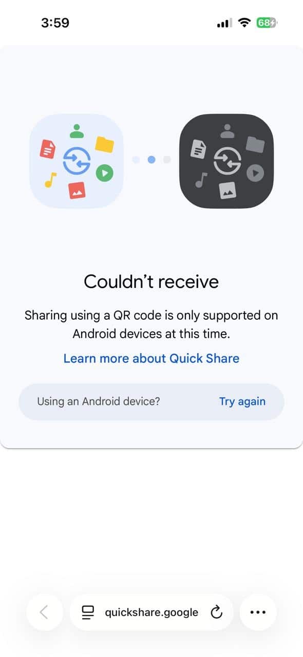 This design choice continues to pay off. When sharing files via QR code, Galaxy users can send files to virtually any device through a secure web link, including iPhones. In contrast, users on Google’s version of Quick Share (found on Pixel and other Android phones) encounter an error message: Sharing using a QR code is only supported on Android devices at this time.