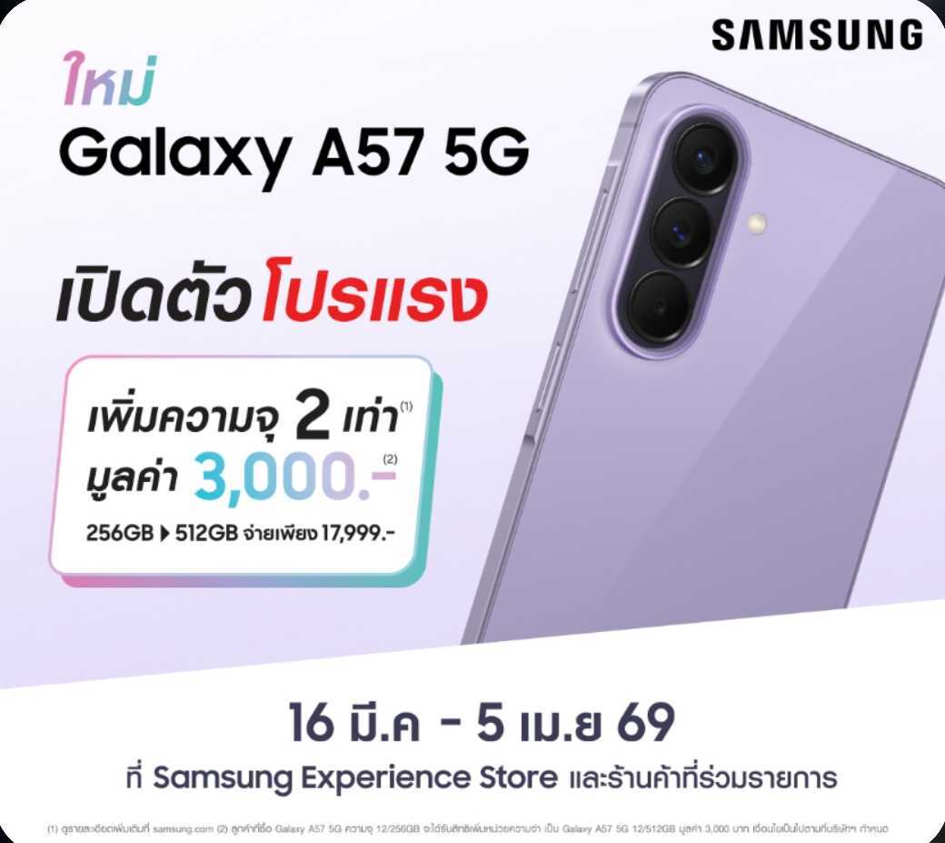 In Thailand, the Galaxy A57 5G starts at 16,999 Thai Baht (THB) for the 8GB RAM and 256GB storage model (available exclusively online). The 12GB + 256GB version costs 17,999 THB, while the 12GB + 512GB variant goes official at 20,999 THB. To celebrate the launch, Samsung is offering double the storage benefits from March 16 to April 5, 2026. If you buy the 256GB version, you will receive the 512GB at no extra cost. You can pick a color from Violet, Dark Blue, or Gray.
