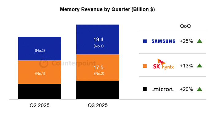 Samsung has reclaimed its long-standing top spot in the global memory market in the third quarter of 2025. According to Counterpoint Research, the company earned $19.4 billion in memory sales, surpassing SK Hynix ($17.5 billion). This is a major achievement for the Korean memory maker, as it suffered setbacks in the first half of the year.