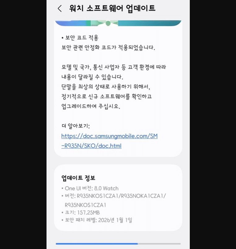 In a Samsung community post, a Galaxy Watch 6 user has confirmed receiving the January 2026 security update in South Korea. The update carries the firmware version R935NKOS1CZA1 with a download size of 157.25MB. Note that the patch is currently available for the cellular (LTE) variant of the watch that bears model number SM-R935N.