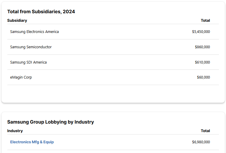 Samsung has different business divisions in the US for several product categories. So, each division spent some money on lobbying. For instance, last year, Samsung Electronics America spent $5.45 million while Samsung Semiconductor spent $860,000. Meanwhile, Samsung SDI America spent $610,000 during the same period. Summing up all, Samsung’s total lobbying expenditures were $6.98 million in 2024.