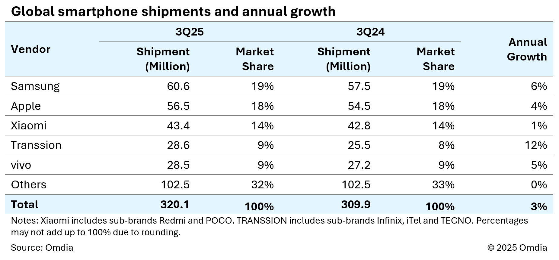 Speaking of the overall global market, smartphone shipments reached 320.1 million units in Q3 2025, representing a 3% year-on-year increase. However, the industry continues to face challenges such as component shortages and rising manufacturing costs.