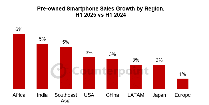 In India, the market grew 5% YoY in H1 2025, with Samsung leading the segment, even though its growth dropped to 1% YoY. The company’s refurbished Galaxy S22 and S23 series sold well during that period. Likewise, in Southeast Asia (5% YoY), Samsung saw a decline of 3% YoY despite its trade-in programs, partnerships with Laku6 (Carousell Group), and focus on after-sales engagement.