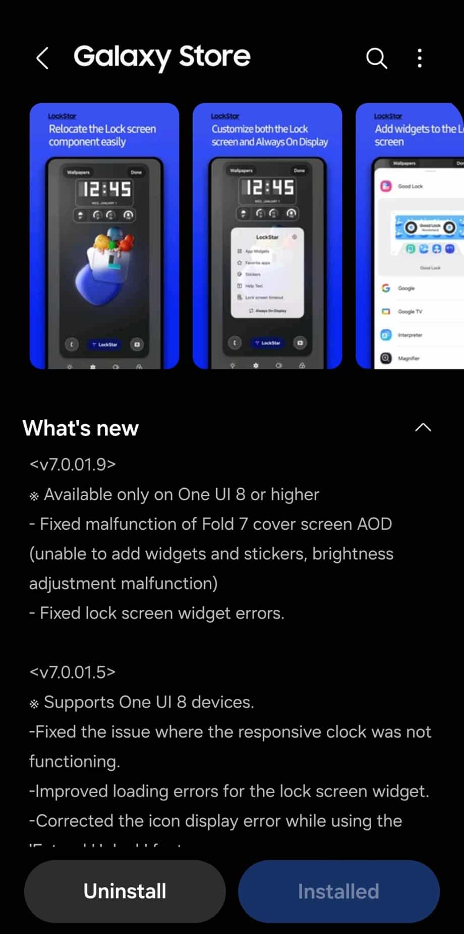The latest update for this app fixes an annoying issue on the Galaxy Z Fold 7. Users have had trouble applying widgets and stickers to the new Fold’s cover screen AOD. Brightness controls also didn’t behave correctly, and Samsung patched that bug as well. Moreover, LockStar version 7.0.01.9 addresses a persistent lock screen widget issue affecting all Galaxy models on One UI 8.
