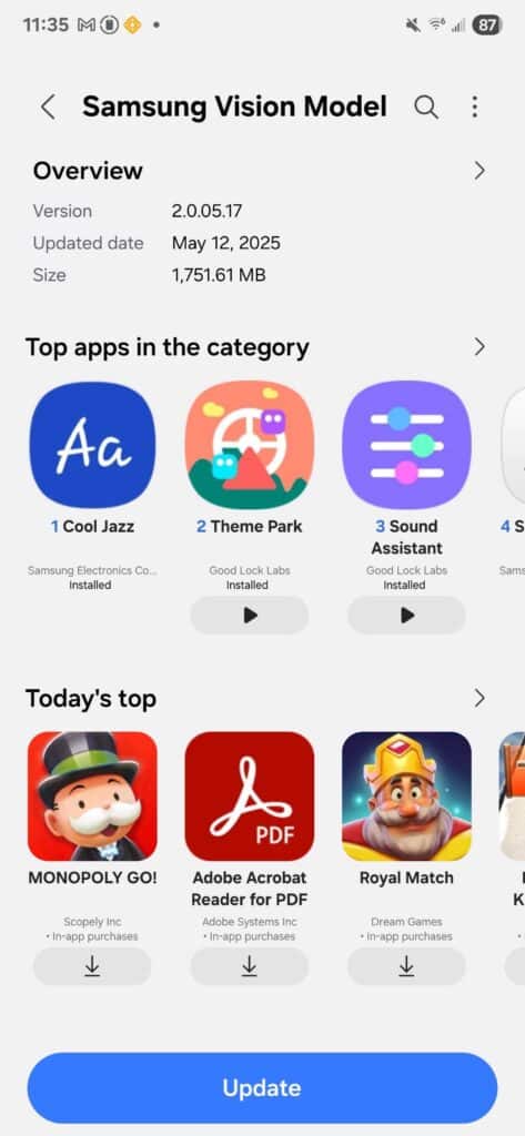 Since generative AI-based solutions require a lot of data and information for accurate results, Samsung’s Vision AI Model app is massive in size. For example, Live Translate uses AI to translate your voice in real time during calls. So, the Vision AI Model app needs to keep adding extensive language datasets for better speech recognition. The latest version (2.0.05.17) should bring improvement to several generative AI solutions for an enhanced user experience.