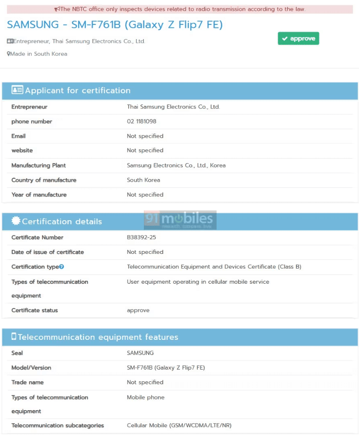As spotted by 91Mobile, Thailand’s NBTC website has listed a Galaxy smartphone bearing the model number SM-F761B. More importantly, the listing confirms the marketing name: Galaxy Z Flip 7 FE. Since this is the country’s regulatory body for broadcasting and telecommunications, the information in the certificate listing is likely correct.