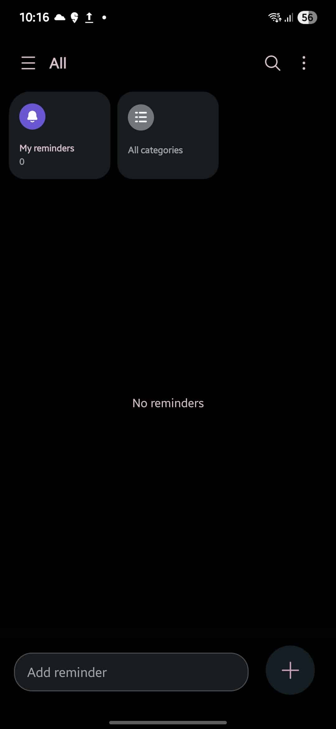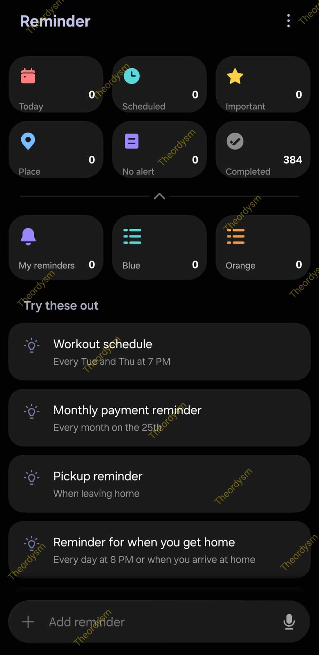 One UI 8 introduces a much more streamlined layout. The top section now has six smaller tiles: Today, Scheduled, Important, Place, No alert, and Completed. Each tile displays the number of reminders it contains, giving you a clear snapshot of what’s on your plate. Notably, the Reminder app in One UI 8 ditches the old hamburger menu on the top left, opting for a cleaner design.