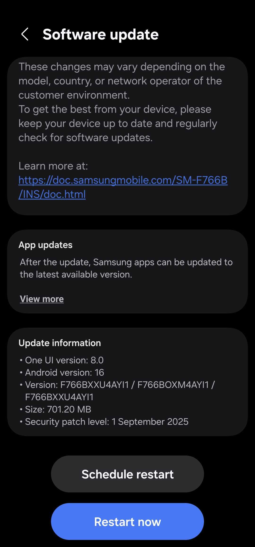 To update any of these foldable devices to the September 2025 security update, go to Settings > Software update > Download and install. Once the update appears, tap Update and wait for the installation to complete. Afterward, you can restart your phone. For the Galaxy Z Fold 7, the update is approximately 790 MB. On the Galaxy Z Flip 7 and Flip 7 FE, it’s about 701 MB and 569 MB, respectively.